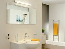 Идеальный настенный светильник для ванной комнаты – эта та модель, которая выдает строго направленный свет. Хороший пример – так называемый навесной светильник «для аквариума», который в ванной комнате обычно крепится над зеркалом. Подобный настенный вариант – это отличный способ подсветить именно ту зону зеркала, которая обычно активно используется для выполнения различных процедур.