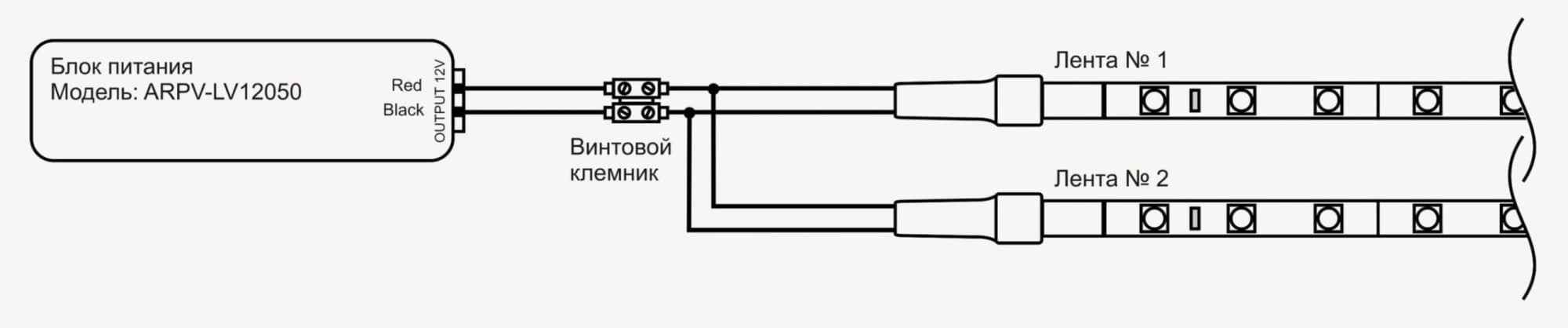 Соедините светодиодные ленты с блоком питания с помощью прилагаемого винтового клемника. Подключение лент необходимо производить параллельно. Лента №1 подключается непосредственно к клемнику, лента №2 подключается с помощью дополнительного кабеля к клемнику.