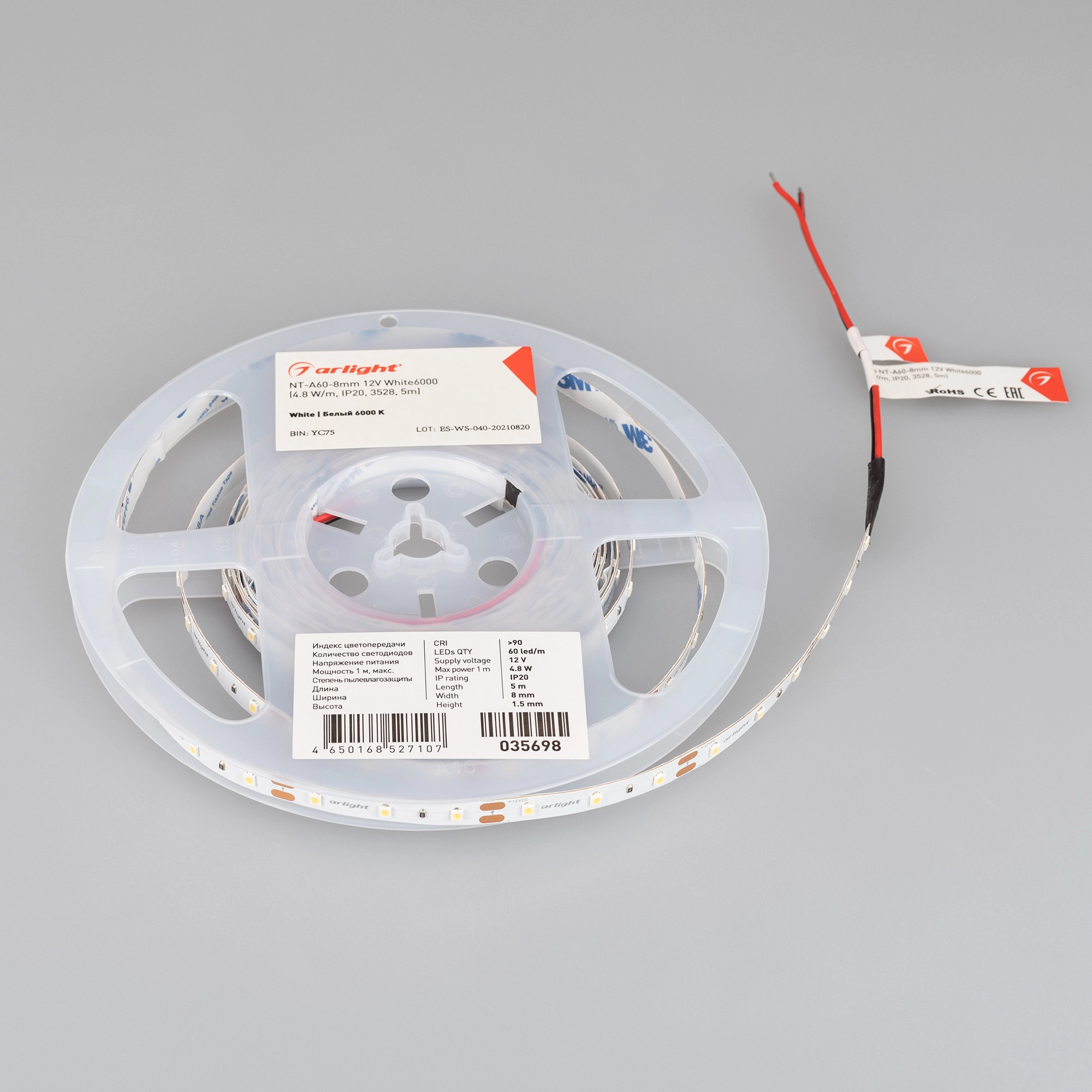Светодиодная лента NT серии A60. Светодиоды SMD 3528, 60 шт/м, белая плата шириной 8 мм, скотч 3M. Цвет БЕЛЫЙ 6000K, индекс цветопередачи CRI>90, угол 120°. Питание 12 В, мощность 4.8 Вт/м (24 Вт на 5 м).  Размеры 5000x8x1.5 мм. Мин. отрезок 50 мм, 3 светодиода. Цена за 1 м.