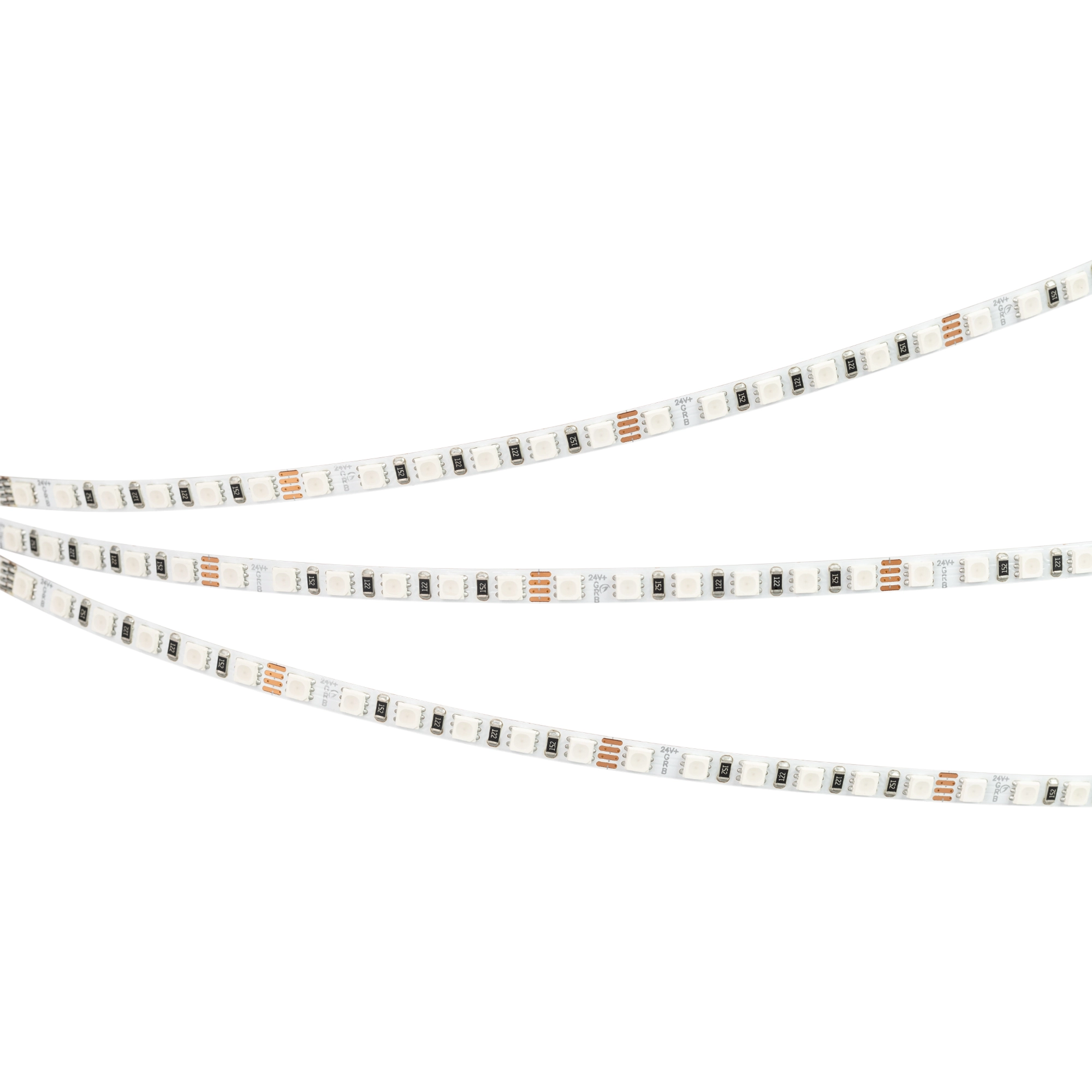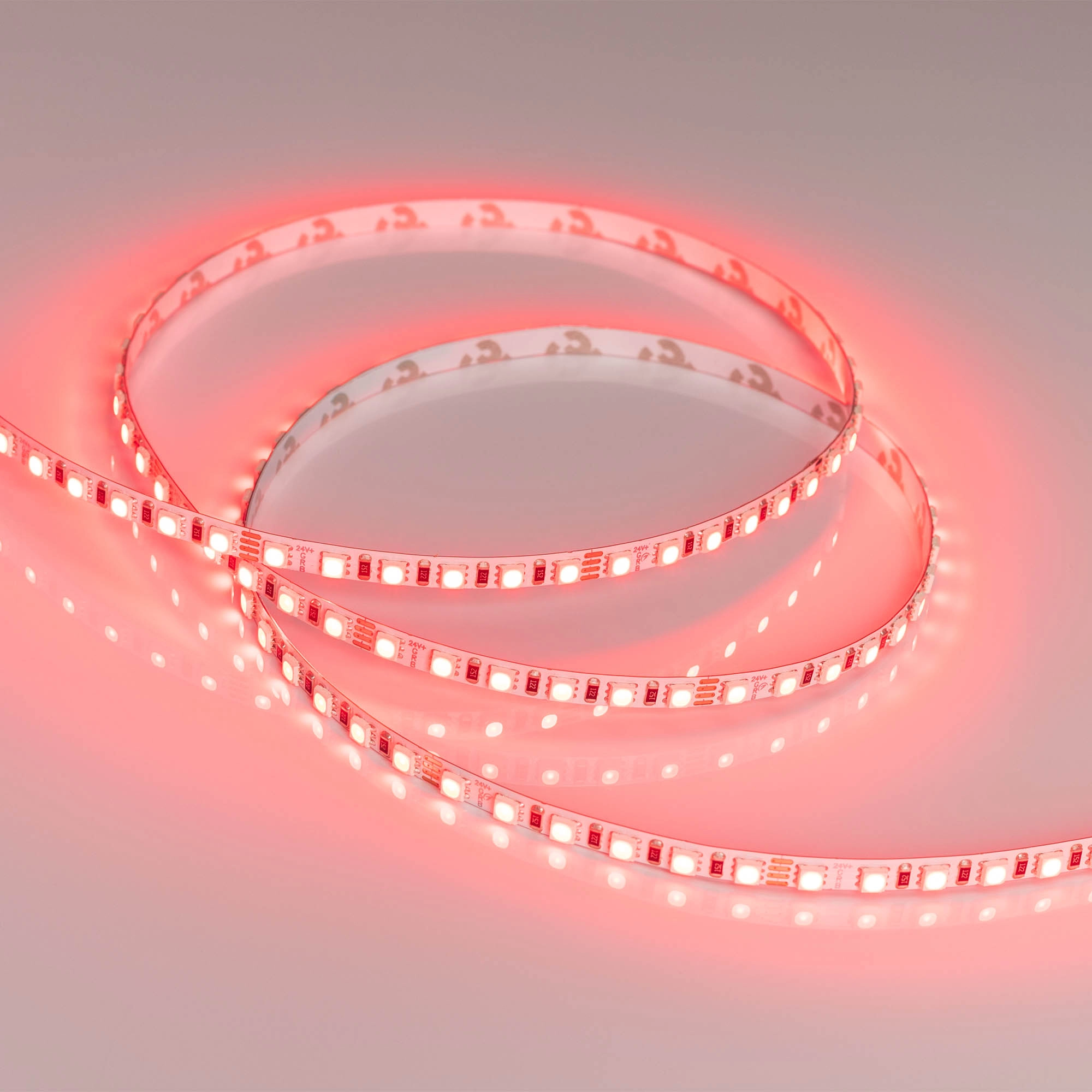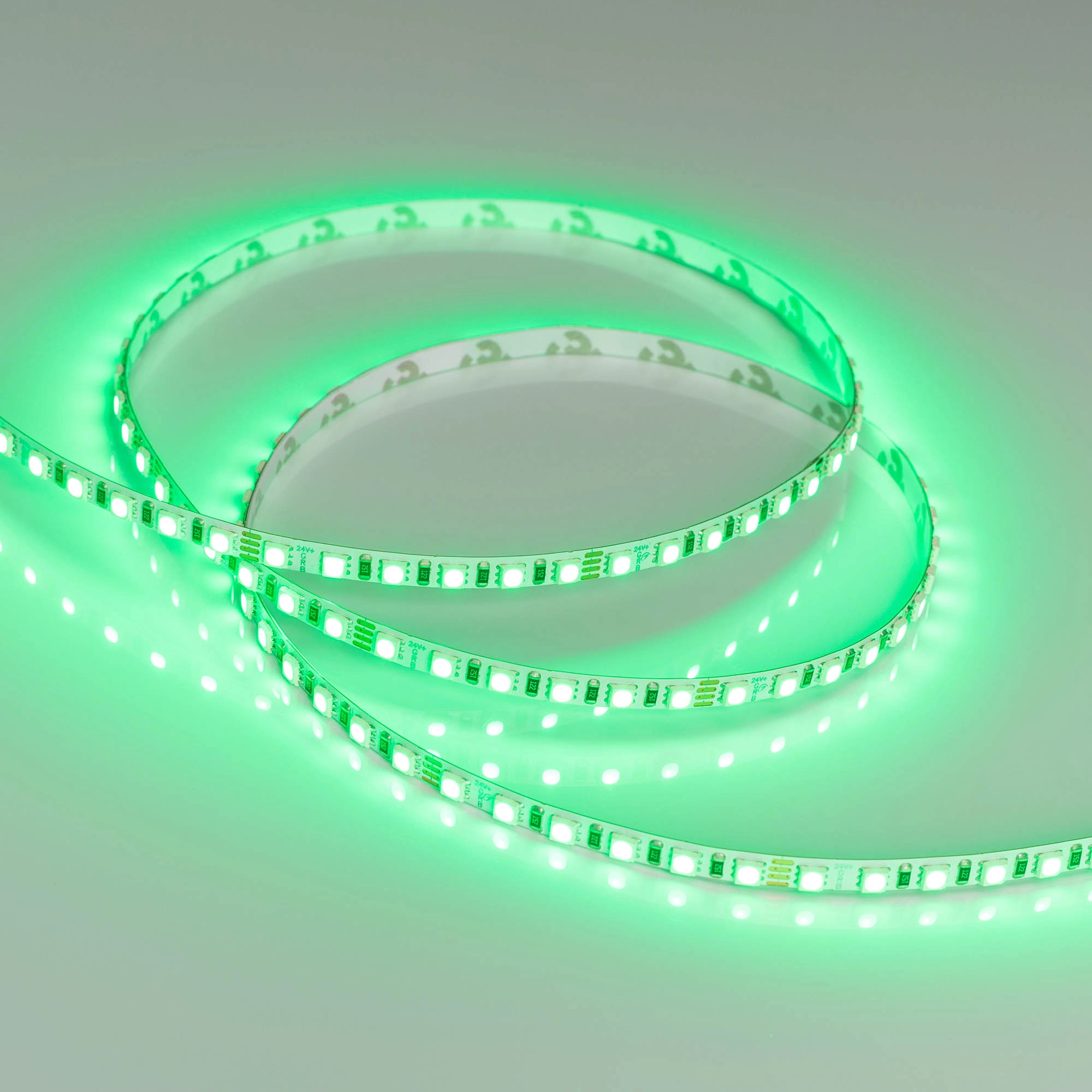 Мультицветная лента серии RT G120. Светодиоды SMD 3838, 120 шт/м, белая плата шириной 5 мм, скотч 3M. Цвет RGB. Питание 24 В, мощность 7.5 Вт/м (37.5 Вт на 5 м), угол 120°. Размеры 5000x5x1.9 мм. Мин. отрезок 50 мм, 6 светодиодов. Цена за 1 м.