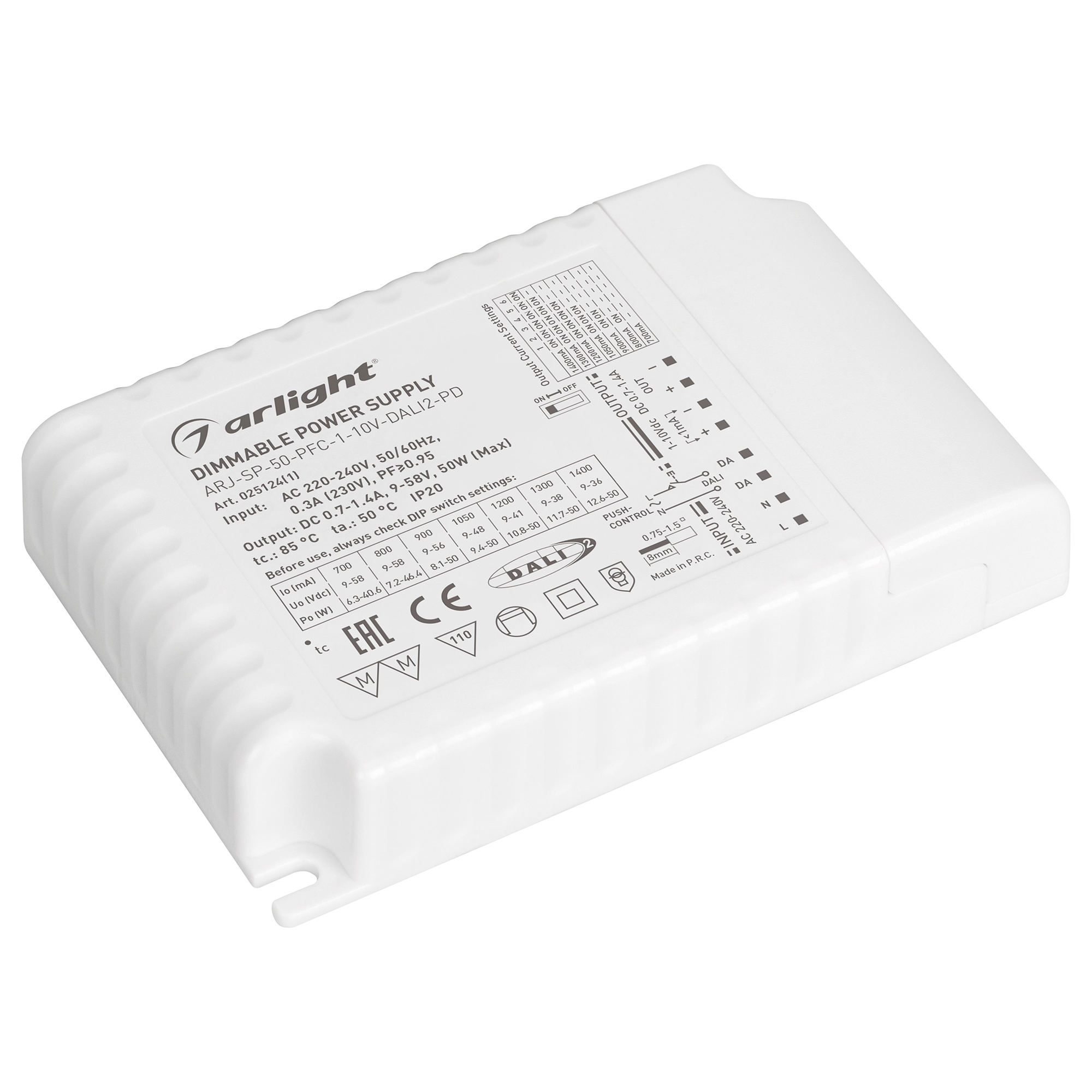 Диммируемый источник тока по протоколу DALI 2.0 (диапазон 2-100%) и 1-10V (диапазон 2%-100%) с гальванической развязкой для светильников и мощных светодиодов. Входное напряжение 220-240 VAC. Выходные параметры: 9-58В (700/800мА), 9-56В (900мА), 9-48В (1050мА), 9-41В (1200мА), 9-38В (1300мА), 9-36В (1400мА), максимальная мощность 50 Вт. Встроенный PFC >0.9. Негерметичный пластиковый корпус IP 20. Габаритные размеры длина 123 мм, ширина 79 мм, высота 24 мм. Гарантийный срок 5 лет.