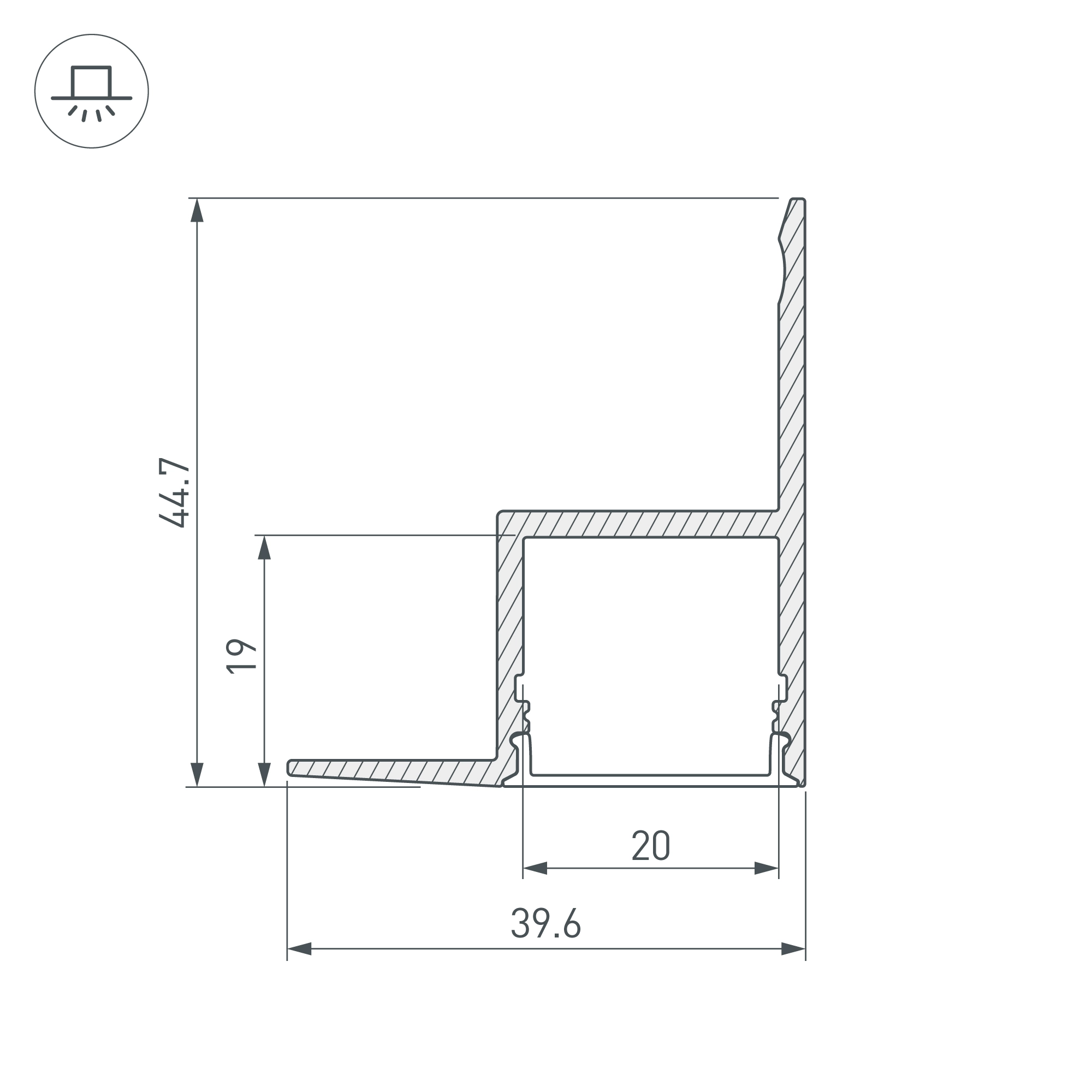 Алюминиевый анодированный встраиваемый профиль для светодиодных лент и линеек. Габаритные размеры (L×W×H): 2000x44,7x39,6 мм. Ширина площадки для ленты 20 мм. Экраны, заглушки и другие аксессуары приобретаются отдельно. Цена за 1 метр.