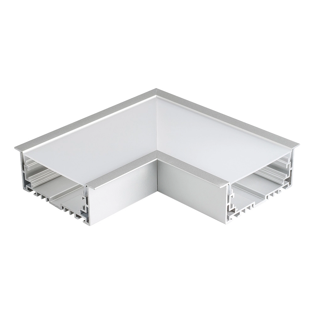 Прямой угол в сборе для соединения 2-х профилей S2-LINIA94-F под прямым углом 90°. Экран образует линию на плоскости. В комплекте матовый экран, соединители. Длина внешней стороны угла 150мм.
