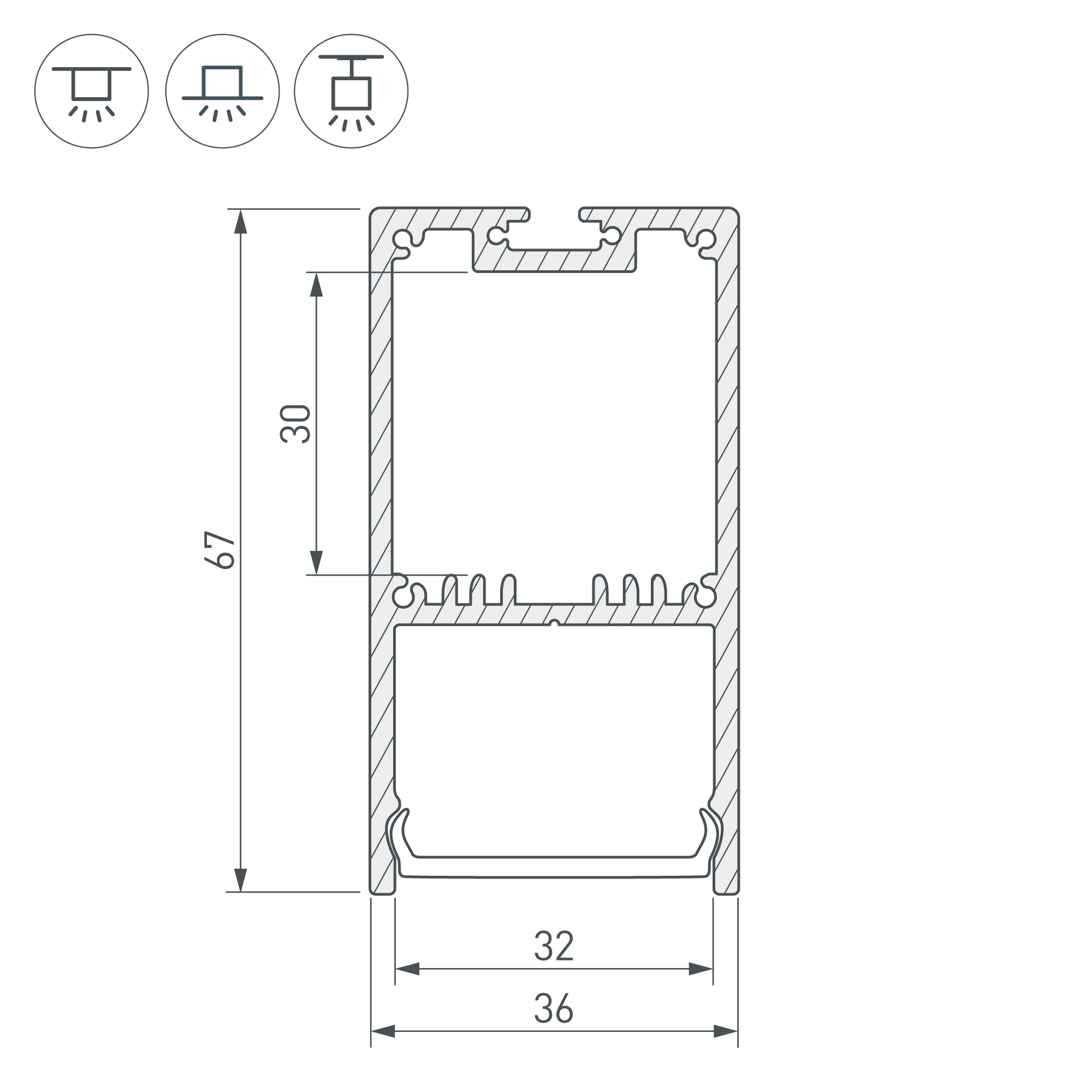 Комплект с экраном. Алюминиевый профиль для светодиодных лент и линеек. Цвет - белый RAL9003 (порошковая окраска). Габаритные размеры (L×W×H): 2500x36x67 мм. Ширина площадки для ленты 32 мм. Отсек для БП 30х32мм. Заглушки в комплекте (4 заглушки белого цвета, 16 шурупов). Аксессуары приобретаются отдельно. Цена за комплект.