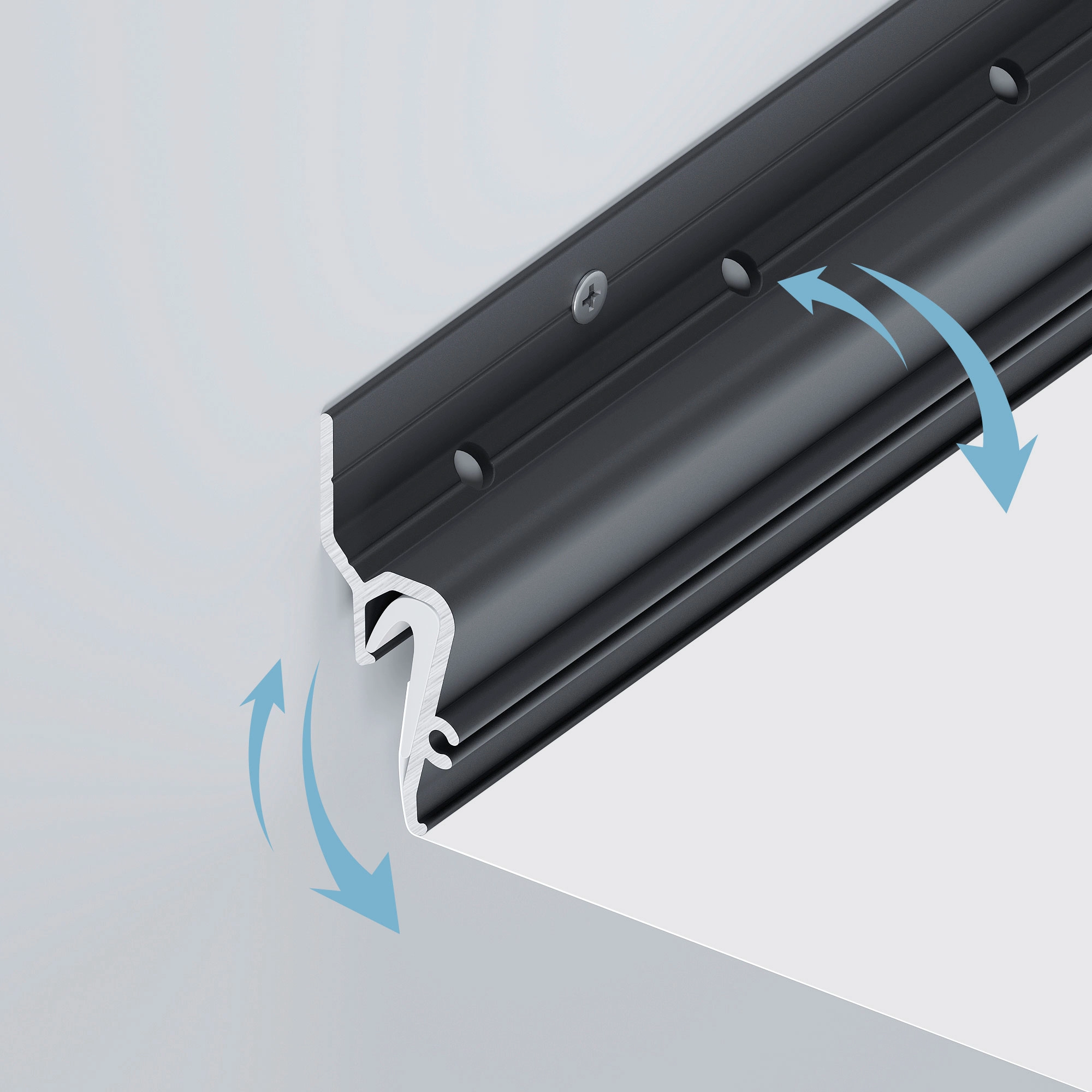Алюминиевый профиль для монтажа натяжного потолка стеновой с теневым зазором 8мм. Цвет - черный RAL9005 (порошковая окраска). Позволяет обеспечить циркуляцию воздуха за пленкой натяжного потолка через специальные отверстия в профиле. Гарпунная система монтажа. Габаритные размеры (L×W×H): 2000x14x37мм. Цена за 1 метр.