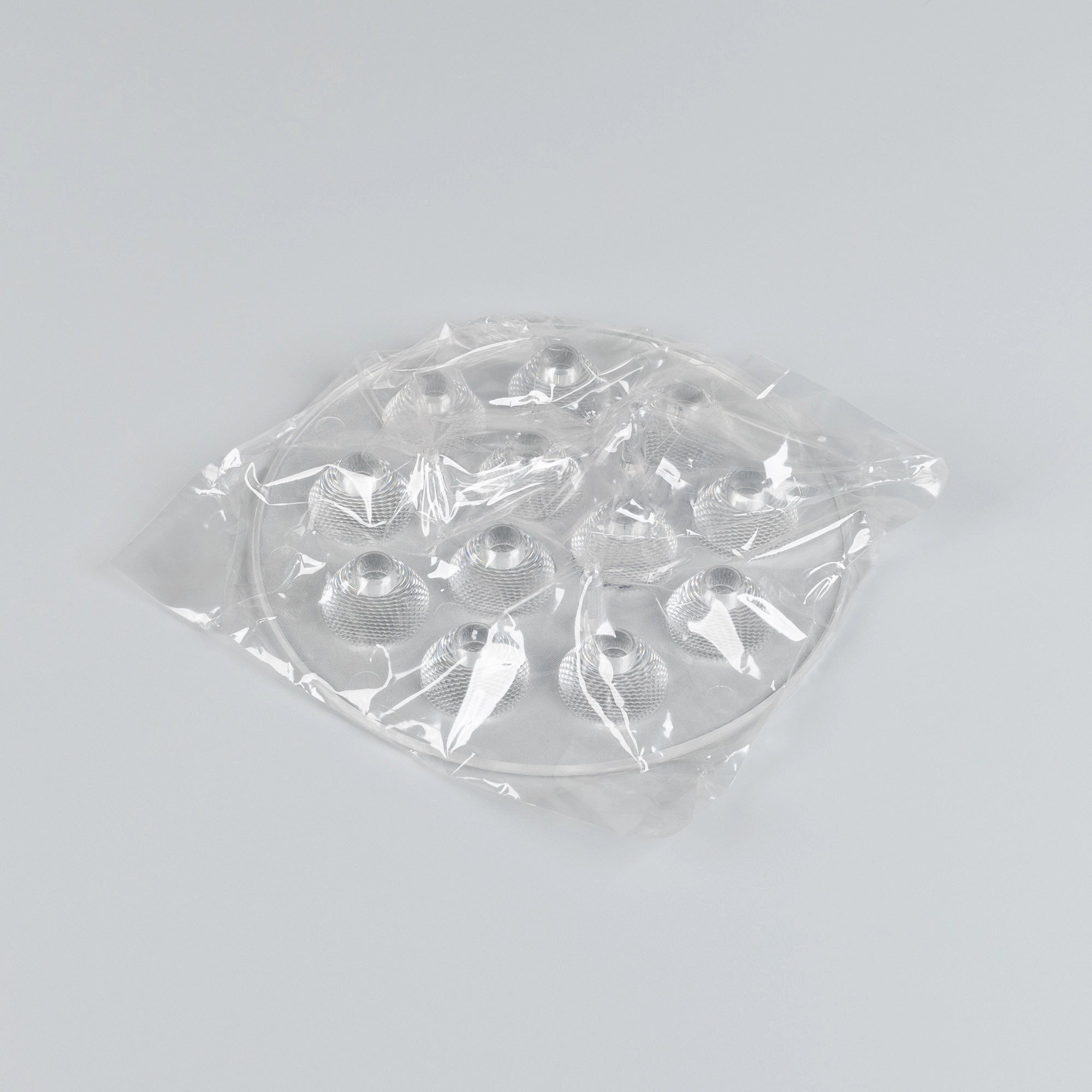 Блочная линза для мощных светодиодов Emitter, угол обзора: вертикальный 30°, микролинза Френеля. Материал PMMA, количество светодиодов на плате: 12. Диаметр 120 мм, высота 16.7 мм.