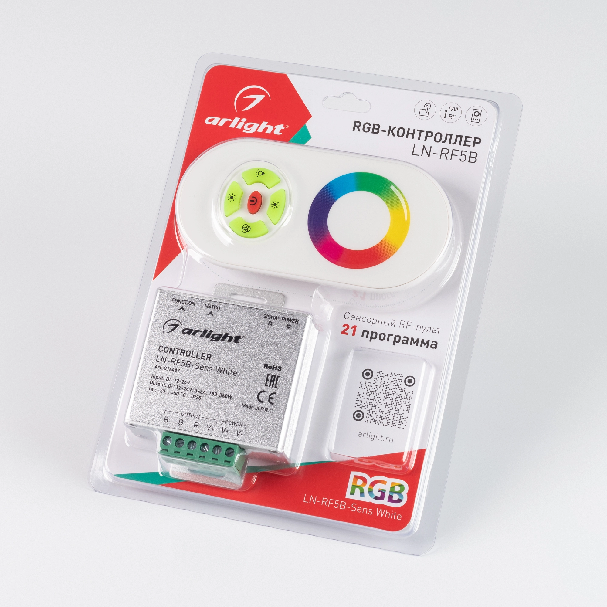 RGB-контроллер (овальный белый радиопульт с 5 кнопками и сенсорным кольцом) Выбор цвета с помощью сенсор. кольца, прямой выбор белого цвета, 12-24V, 180/360W, 5A/канал. 85х65х24мм. Сохраняет состояние при выкл. питания. Если был выключен с пульта - в момент подачи питания происходит вспышка и затем выключение.