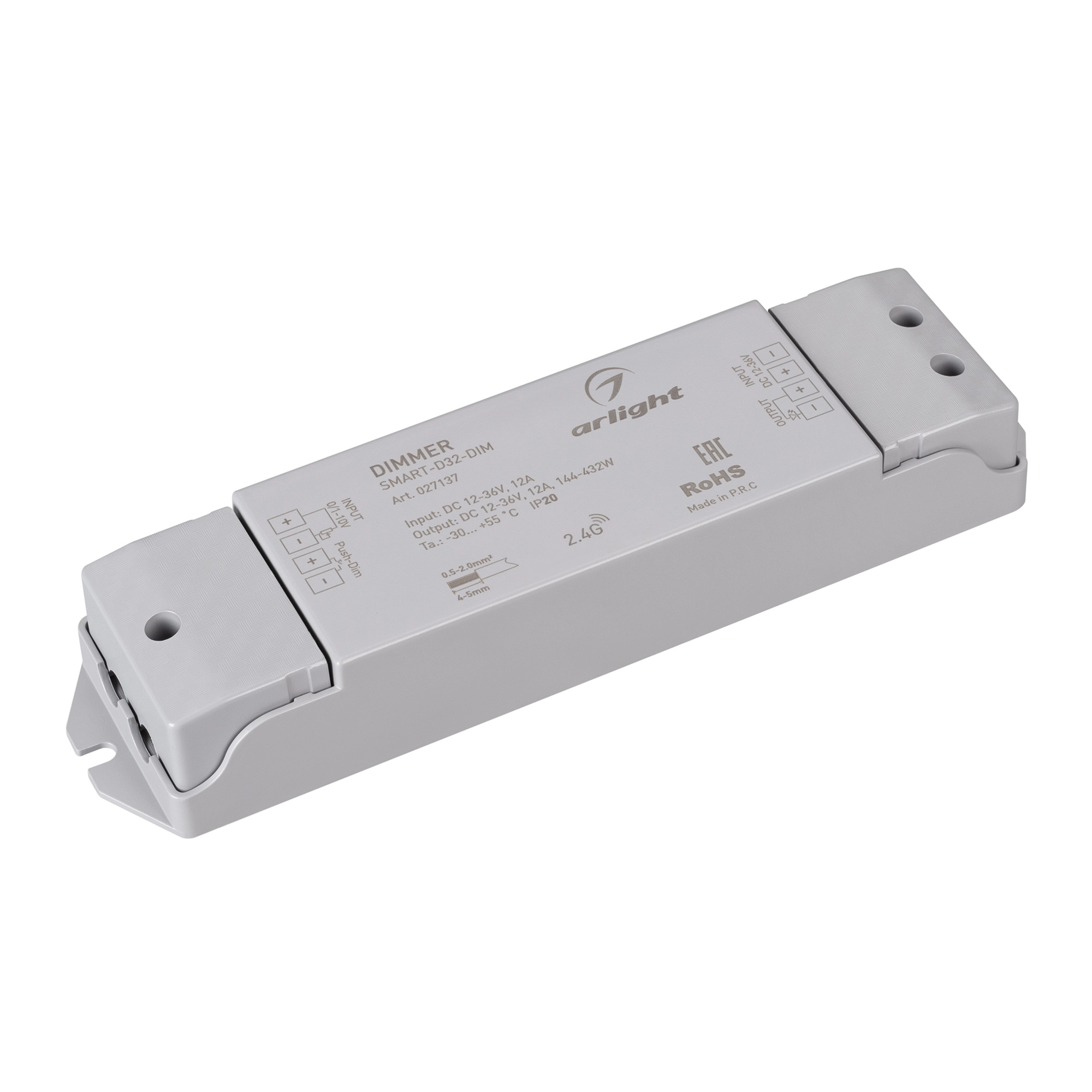 Диммер для одноцветных источников света (0/1-10V). Питание/рабочее напряжение 12-36VDC, входной/выходной ток 12А, выходная мощность 144-432W. Корпус - PVC. Габариты 175х45х27 мм. Управляется 0/1-10V панелями серии SMART (поставляются отдельно).