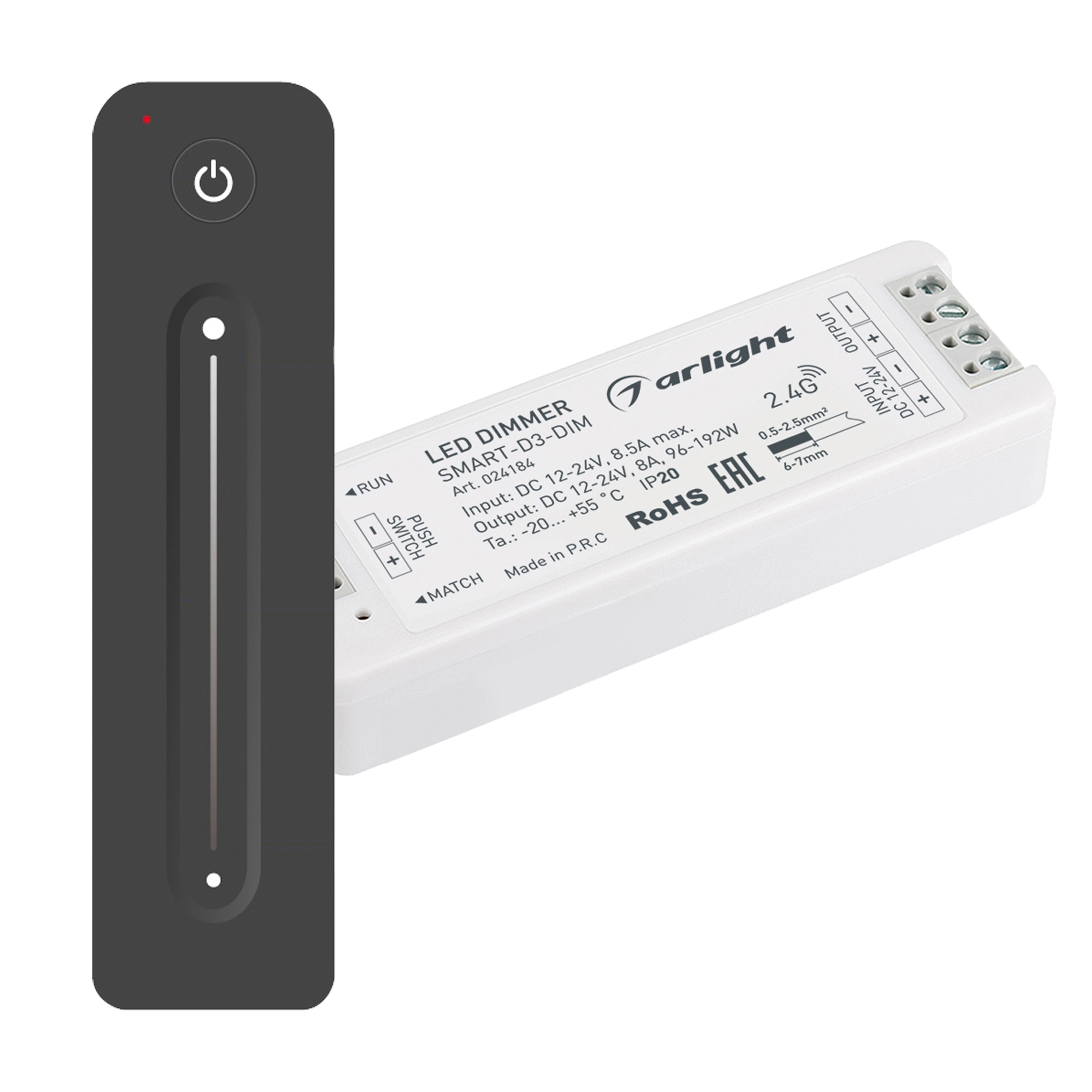 Комплект диммера с пультом для одноцветной светодиодной ленты (ШИМ). Питание/рабочее напряжение 12-24VDC, максимальный ток 8A на канал, 1 канал, максимальная мощность 96-192W. Габариты диммера 97x33x18 мм, габариты пульта 139x36x11 мм.