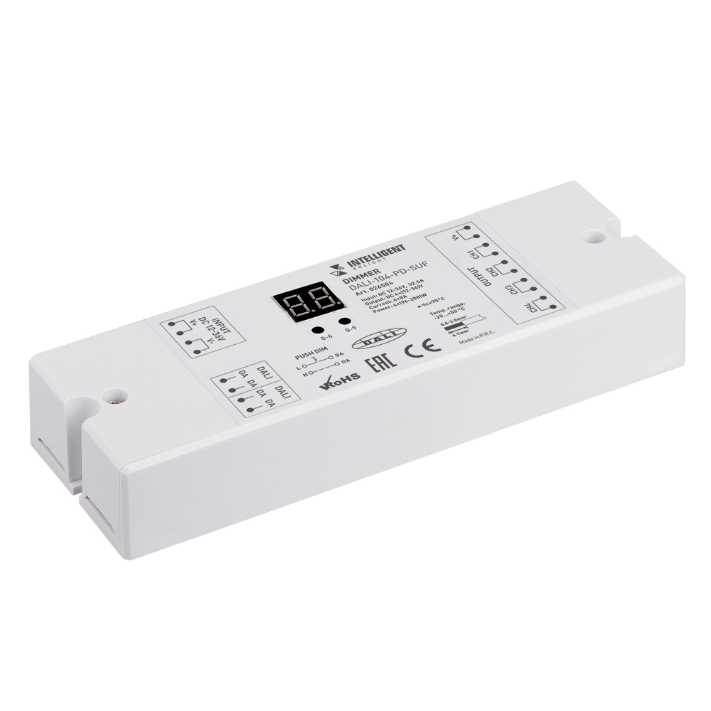 Мощный DALI диммер на 4 адреса, для одноцветных или RGBW светодиодных лент, 4 асинхронных канала. Управляется сигналом DALI или кнопками PUSH DIM. Питание\выход 12-36 VDC. Высокая частота ШИМ 1500Гц. Макс.ток 4x8A. Размеры 168x58x28 мм.