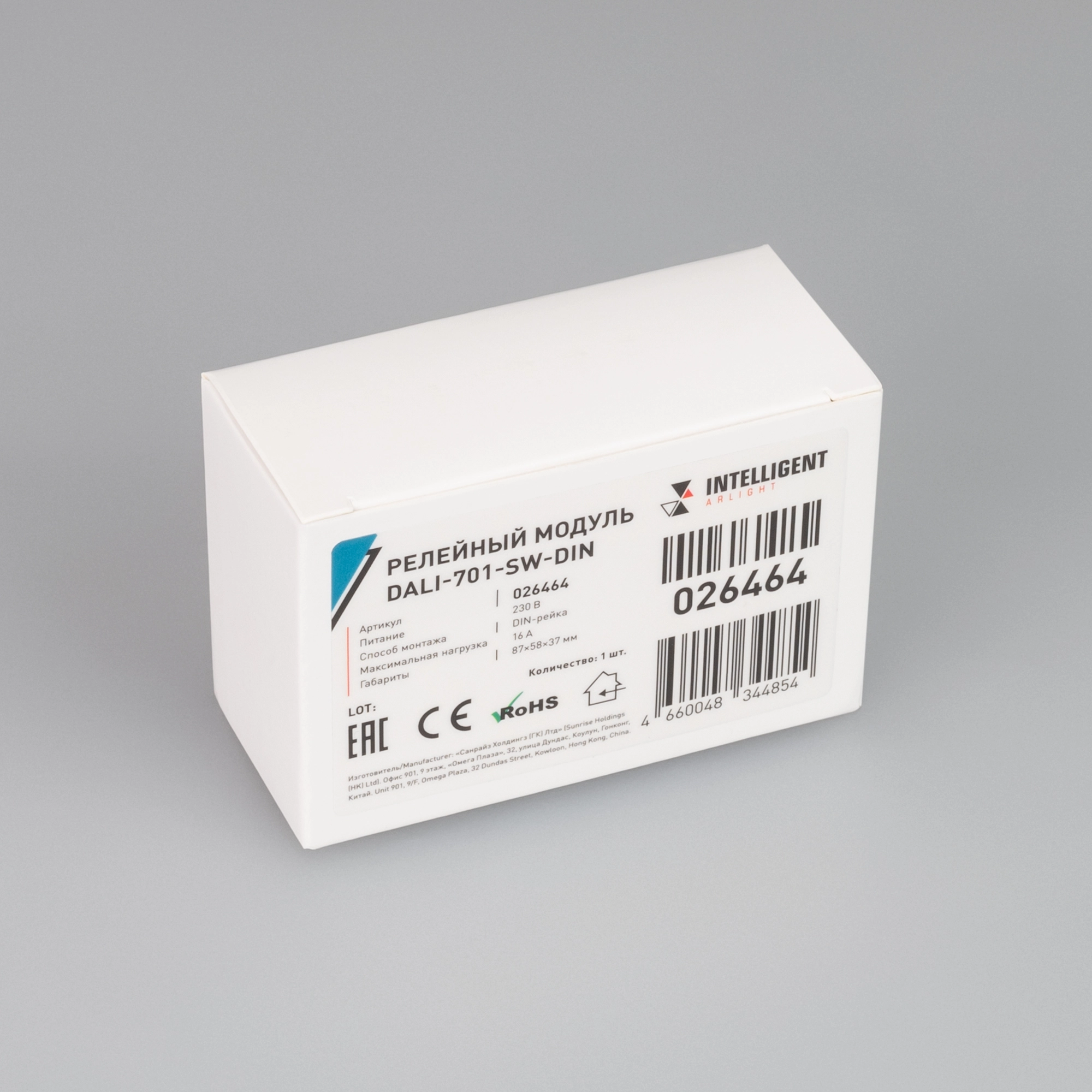 Релейный одноканальный модуль с управлением по DALI для сети 220В. Вход / выход 100-240В, максимальный коммутируемый ток 16А. Размеры 87х58х37 мм.