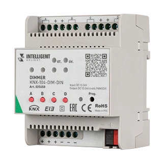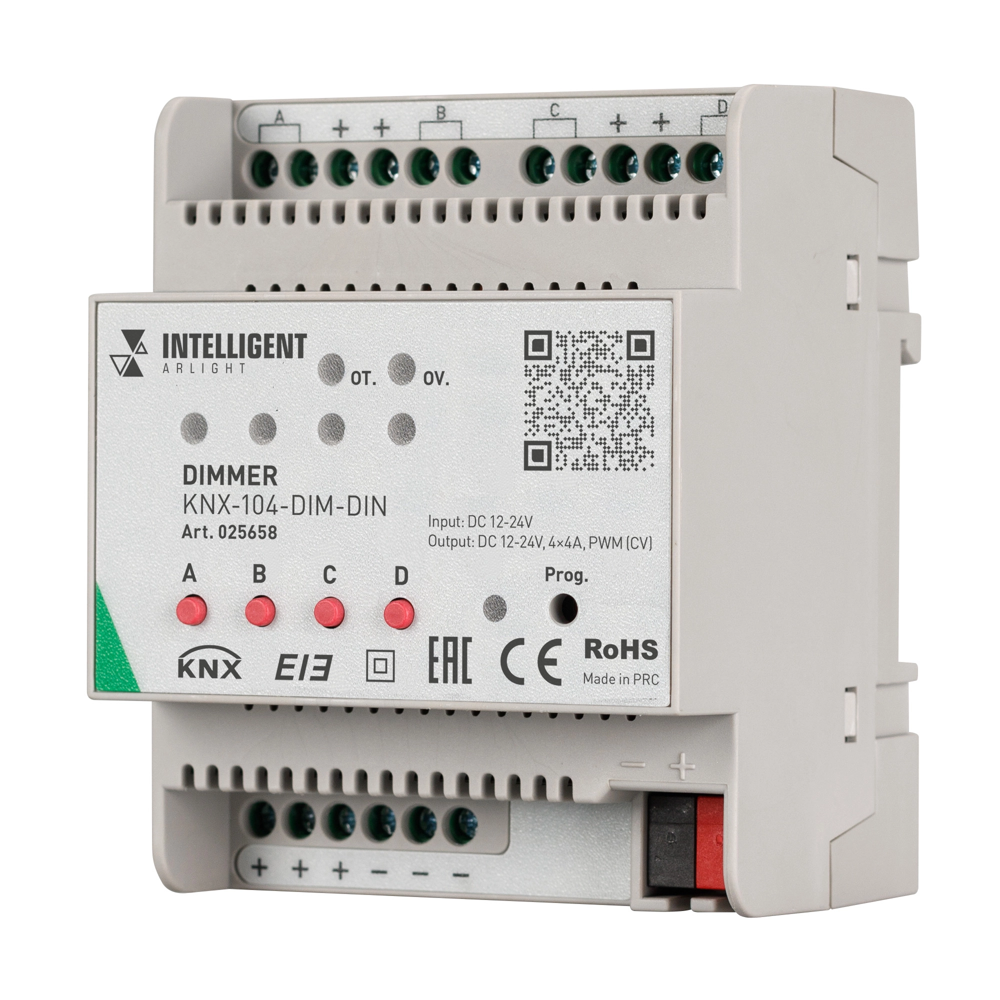 Универсальный диммер стандарта KNX для установки на DIN-рейку. Питание DC 12-24V, ток нагрузки 4А на канал, 4 канала управления. Возможность ручного управления. Подходит для работы с 5V лентами/лампами. Мощность 192-384W.