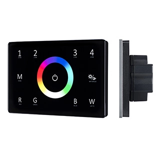 Встраиваемая сенсорная панель 2.4 ГГц, цвет чёрный. Итальянский стандарт. Материал - стекло. Для управления RGBW источниками света (ШИМ), 4 зоны управления. Функция управления DMX512 устройствами. Питание/рабочее напряжение AC 85-265V. Габариты 120х80х37 мм, устанавливается в стандартный подрозетник. Панель совместима с контроллерами серии SMART.