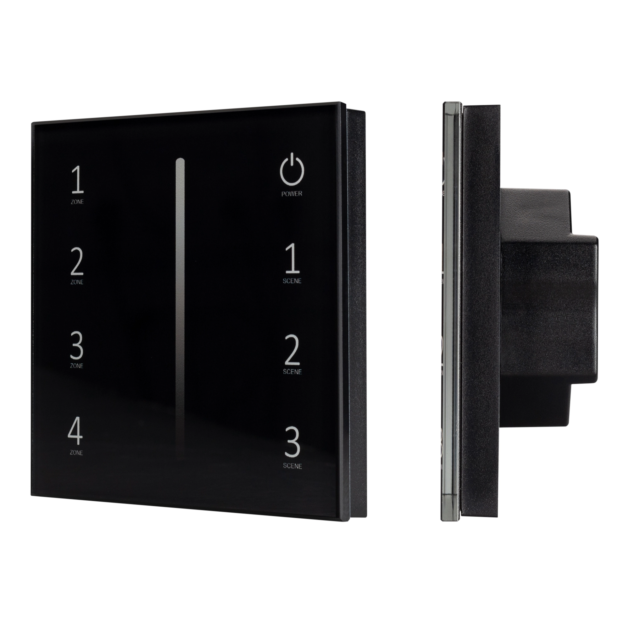 Встраиваемая сенсорная стеклянная панель 2.4 ГГц, цвет чёрный. Для управления яркостью с помощью сенсорной полосы. Питание/рабочее напряжение AC 85-265V, 4 зоны управления, память 4 сцен. Функция управления DMX512 устройствами. Габариты 86х86х36 мм. Панель совместима с диммерами SMART.