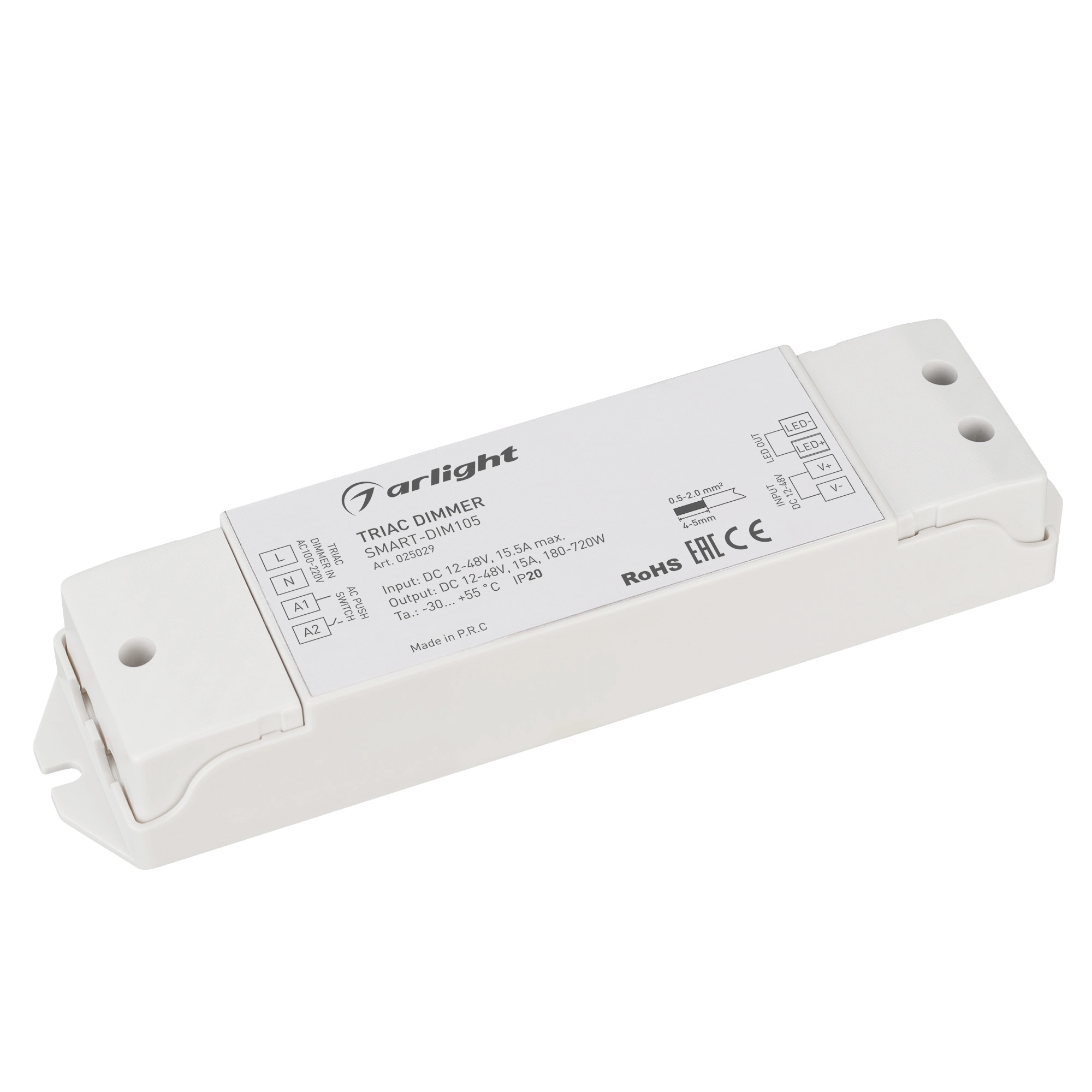 Диммер TRIAC для светодиодных лент. Сигнал управления TRIAC 100-240VAC, питание/рабочее напряжение 12-48VDC, максимальный ток 15A, максимальная мощность 180-720W. Винтовые клеммы. Корпус - PVC. Габариты 175x45x27 мм. Управляется стандартными светорегуляторами TRIAC по переднему фронту (LE).