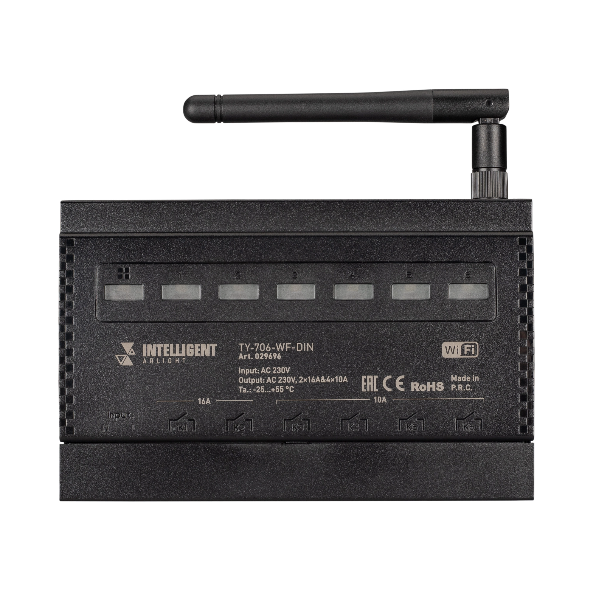 Релейный модуль 6-ти канальный для включения и выключения любой нагрузки (источники света, вентиляторы, приводы, бытовая техника и т.п.) управляемых по 230в. 2 канала по 16A + 4 канала по 10А на резистивной нагрузке. Совместим с RF панелями TY-228-*-RF. Имеет возможность полноценной работы в режиме SLAVE по MODBUS RTU. Напряжение питания 230В. Выход - сухие контакты реле. Монтаж на DIN-рейку. Управление через WI-FI 2.4ГГц.Управляется панелями серии TY-228-х-RF, совместим с платформой TUYA, и АЛИСА от ЯНДЕКС. Управление со смартфона через приложение INTELLIGENT ARLIGHT. Габариты модуля 125x80x34