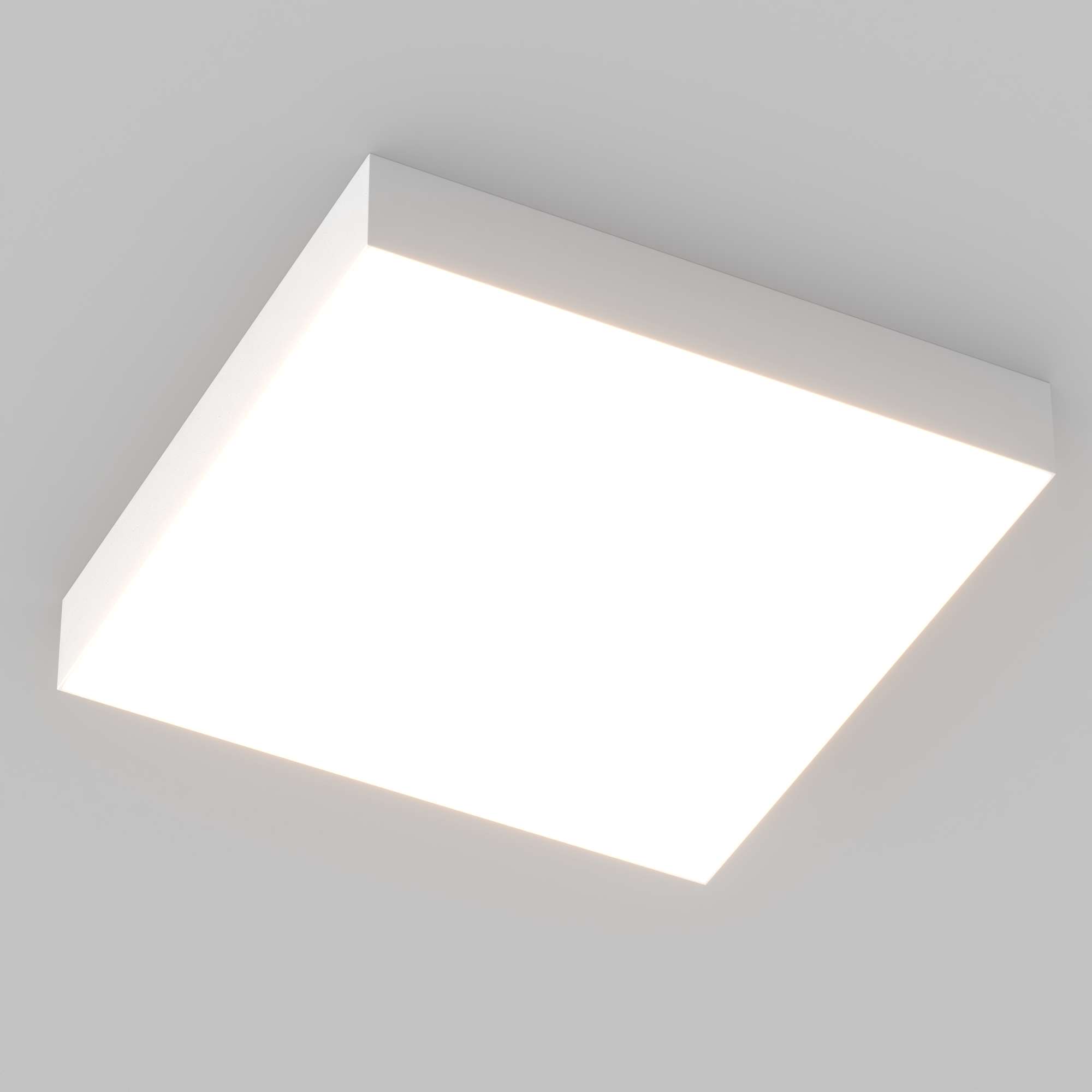 Накладной светильник. Мощность 40 Вт, св. поток 2590-3200 лм, 80 лм/Вт, теплый 3000 K, CRI>90, угол 120°, напряжение питания 230 В. Белый квадратный корпус из алюминия, экран PC, степень защиты IP40. Размер: длина 400 мм, ширина 400 мм, высота 64 мм. Монтаж накладной. Драйвер 27-40 В, 1000 мА, пульсация <5%.