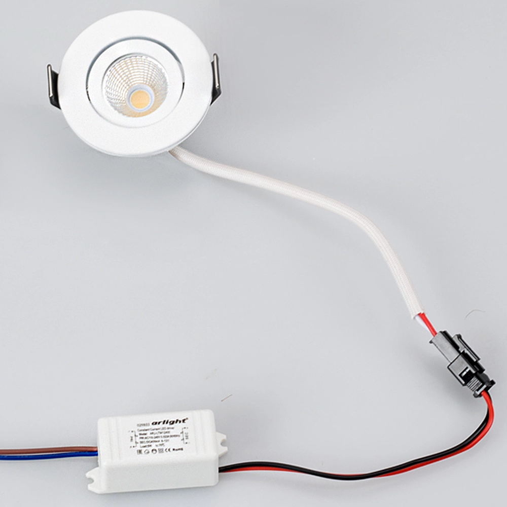 Врезной круглый мебельный светильник 5Вт, корпус белый алюминий. Цвет БЕЛЫЙ 6000K. Светодиод 1х1W Bridgelux. CRI>80, Св.поток 350-400лм, наклоняемая ось, угол 25°. Питание 110-240VAC, 5Вт, 400mA 11-13V, драйвер в комплекте. Размеры d50x50 мм, врезное отверстие d45 мм.