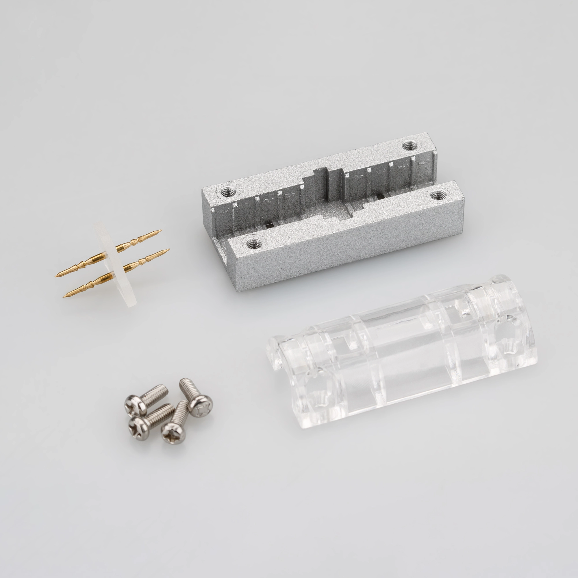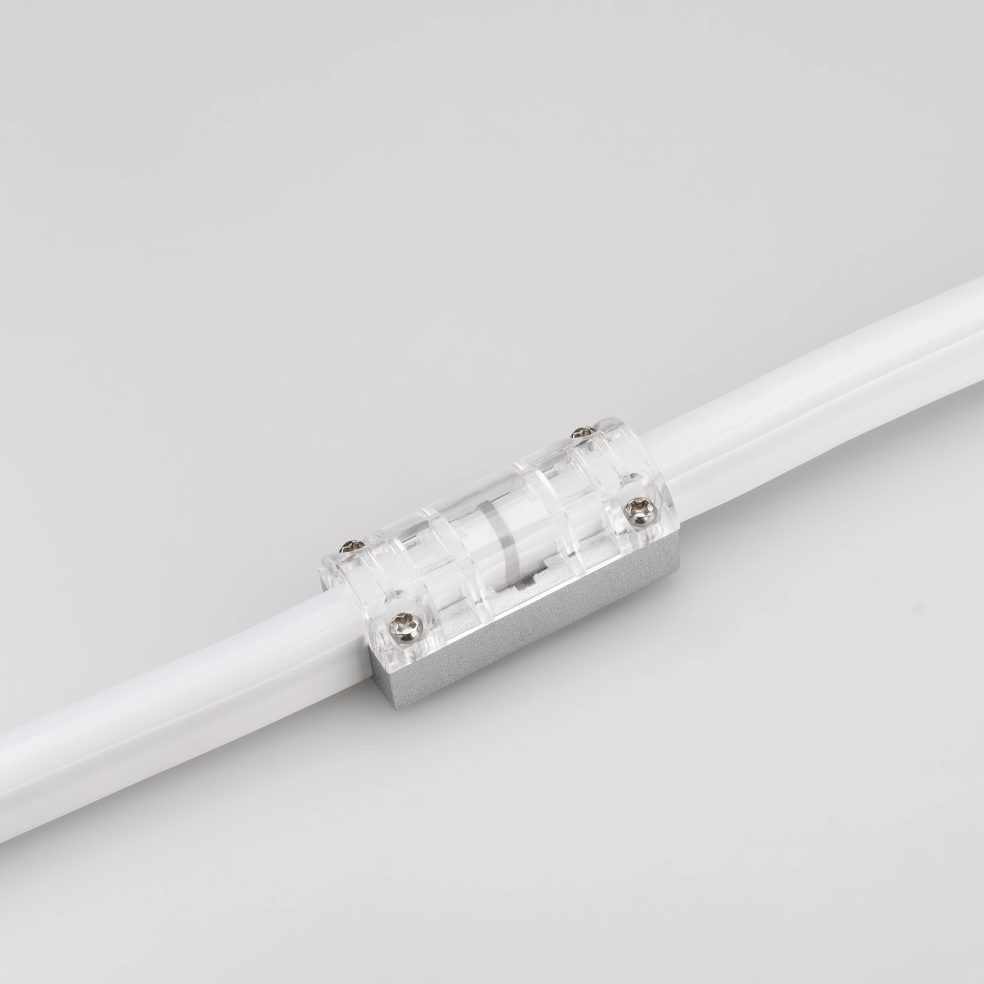 Прямой 2-х контактный соединитель для гибкого неона сечения 16x8mm серии NEON. Обеспечивает непрерывное соединение и сплошную линию свечения без разрывов. Требуется доп.герметизация для соединения IP65. Материал-алюминий, прозрачный пластик. Размеры ДхШ: 50х22мм. Цена за 1шт.