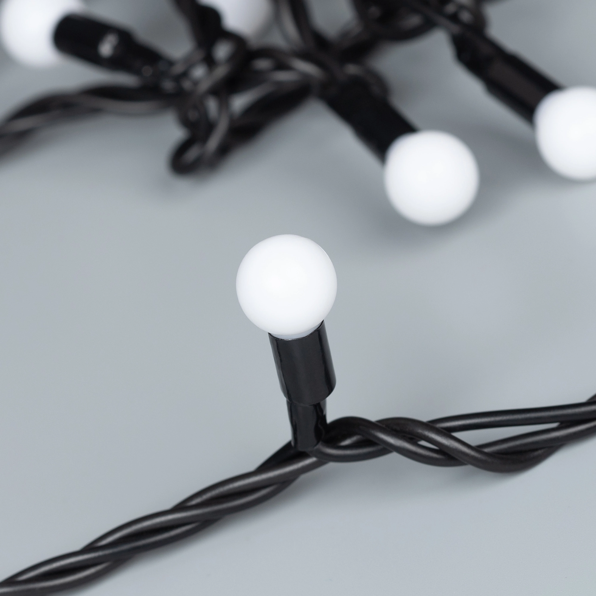 Светодиодные шарики Classic. Размер 5000 мм. Цвет светодиодов RGBY, эффект динамики (автоматическая быстрая смена цвета свечения). 50 шариков со светодиодом внутри размером 13 мм с мягким световым рисунком (выпуклая молочно-белая линза). Провод чёрный, ПВХ. Питание 230 В, Мощность 3.5 Вт, защита IP65, применение в помещении и на улице под навесом. Аксессуары для подключения в комплекте.