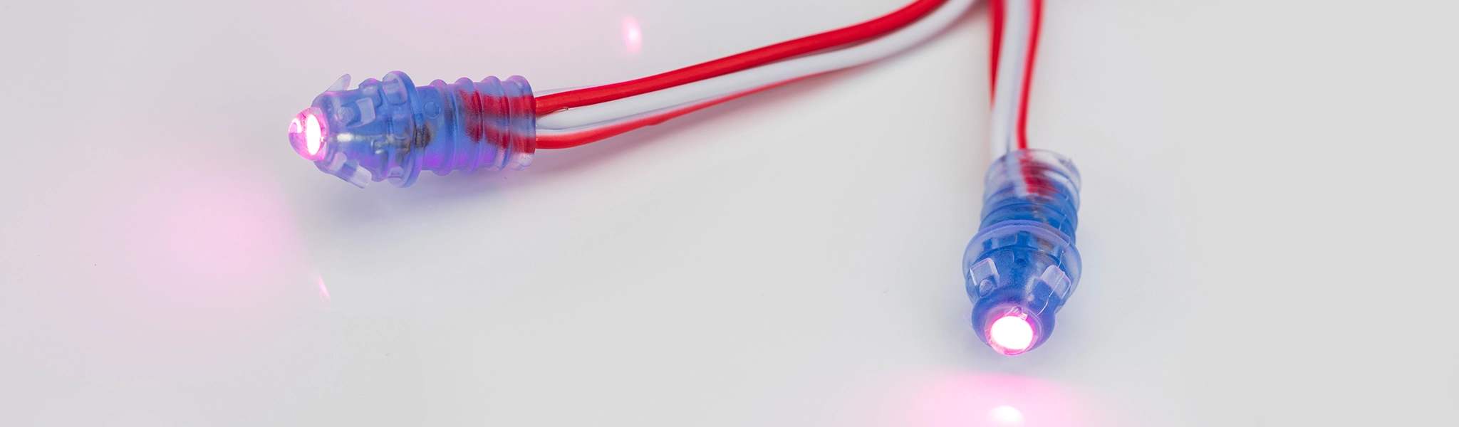 Герметичный светодиодный модуль IP67, 1 светодиод, РОЗОВЫЙ 375 нм, напряжение 5 В, мощность 0.12 Вт, светодиод DIP 5 мм, угол 90°. 50 шт на проводе, расстояние между модулями 65 мм. Размер Ø9×22 мм. Гарантия 1 год.