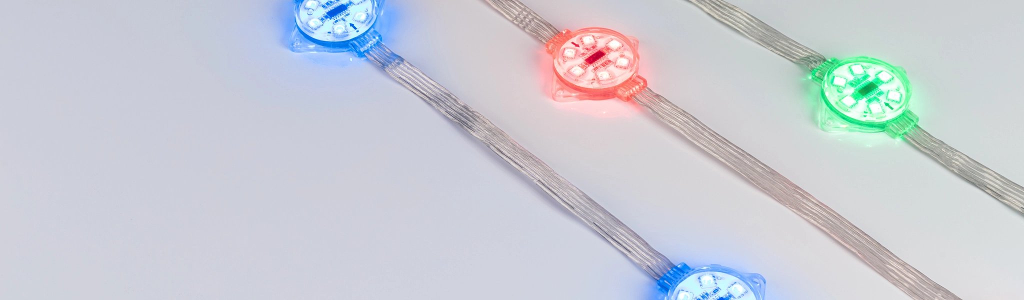 Управляемый светодиодный модуль DMX с держателем, RGB, микросхема TM512AС, напряжение 24 В, мощность 1.5 Вт, 6 светодиодов SMD 5060, угол 120°. Создание медиафасадов. 20 шт на цепочке, 2 цепочки в пакете, расстояние между центрами модулей 240 мм, длина провода между модулями 200 мм. IP68. Размер Ø40×12 мм. Гарантия 3 года. В комплекте инжектор питания.
