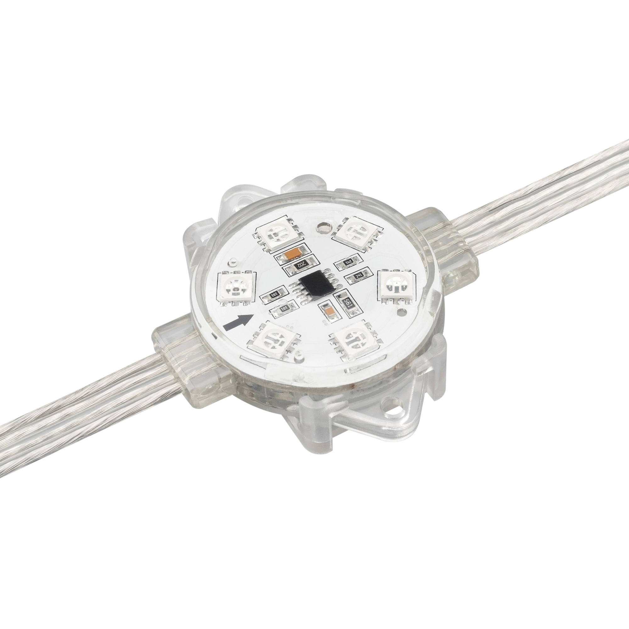 Управляемый светодиодный модуль SPI с держателем, RGB, микросхема RT16703, напряжение 24 В, мощность 1.5 Вт, 6 светодиодов SMD 5060, угол 120°. Создание медиафасадов. Функция обхода битого пикселя. 20 шт на проводе, расстояние между центрами модулей 240 мм, длина провода между модулями 200 мм. IP 68. Размер Ø40×11.2 мм. Гарантия 3 года. В комплекте инжектор питания.