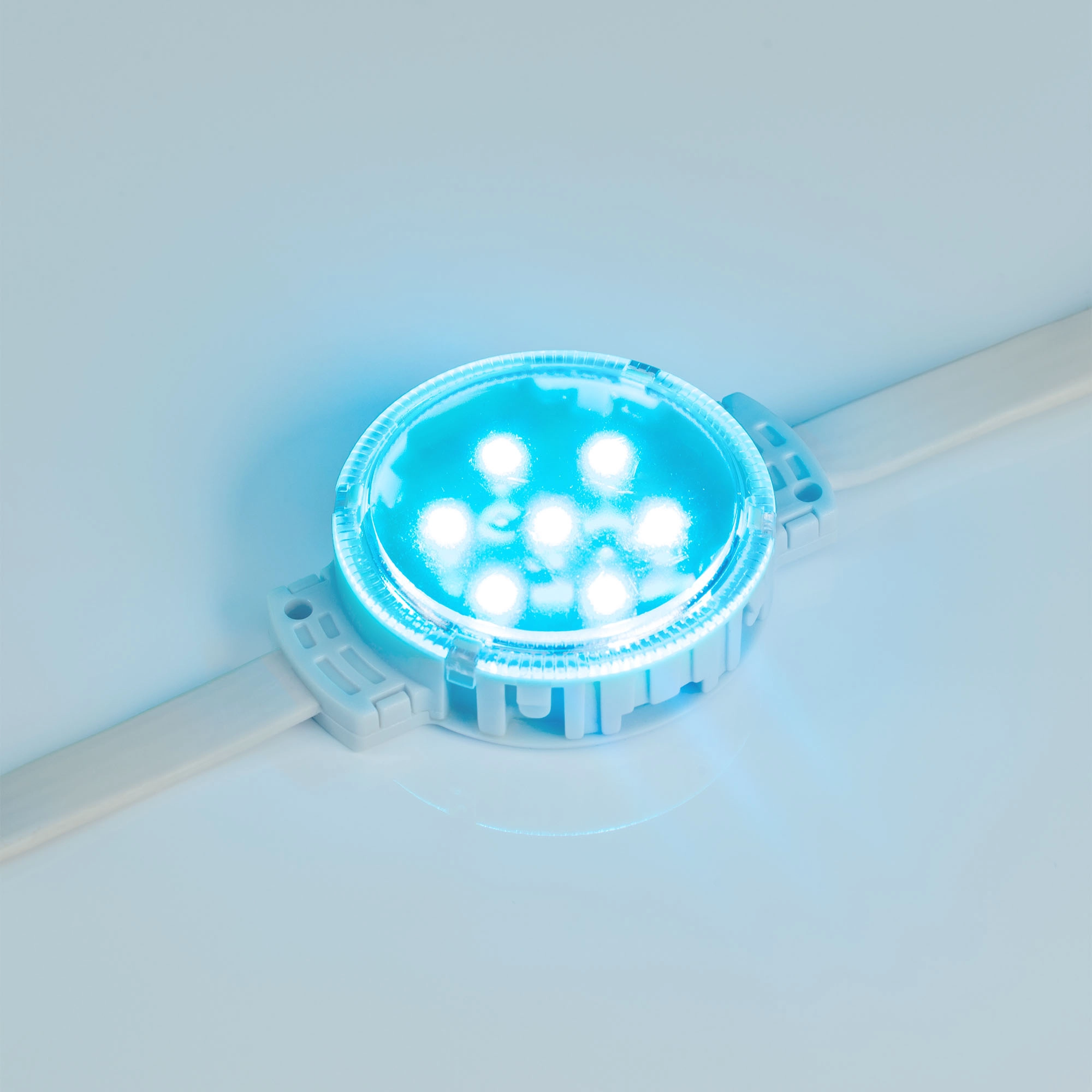 Управляемый светодиодный модуль SPI, RGB, микросхема MT26803, напряжение 24 В, мощность 1.25 Вт, 7 светодиодов SMD 3535, угол 120°. Создание медиафасадов, 30 шт на проводе, расстояние между центрами модулей 170 мм, длина провода между модулями 110 мм. Степень пылевлагозащиты IP68. Размер Ø50×66×16 мм. Гарантия 3 года.