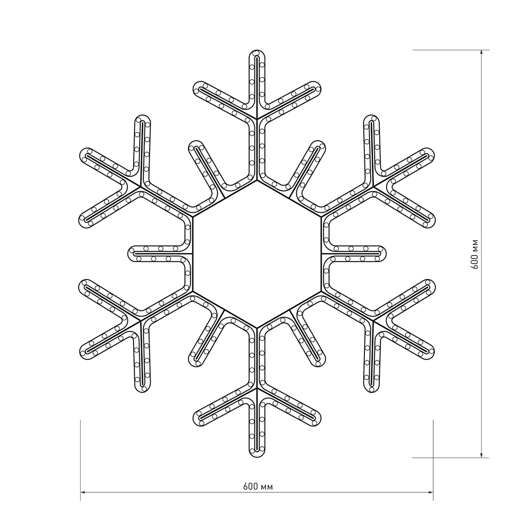 Светодиодная фигура СНЕЖИНКА. Размер 600x600 мм. Цвет светодиодов БЕЛЫЙ (6000 К), постоянное свечение. 216 светодиодов. Напряжение питания 230 В, потребляемая мощность 15 Вт, степень пылевлагозащиты IP65. Фигура укомплектована проводом питания для подключения к сети 230 В (без вилки питания).