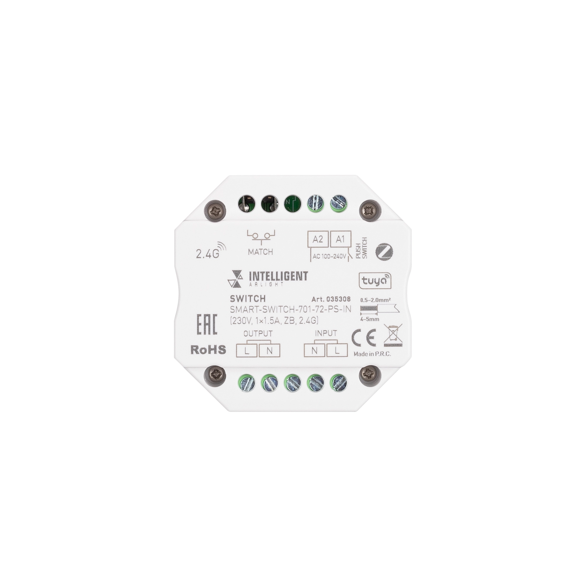 Выключатель для любых видов нагрузки AC 230V. Напряжение питания AC 100-240V, максимальный ток нагрузки 1.5А. Управление 2.4G+WiFi, интерфейс Tuya (через Tuya ZigBee шлюз), поддерживается управление ЯНДЕКС АЛИСА, совместим с приложением INTELLIGENT ARLIGHT. Поддерживает функцию Push-Switch. Габариты 52x52x26 мм. Совместим с пультами и панелями SMART.