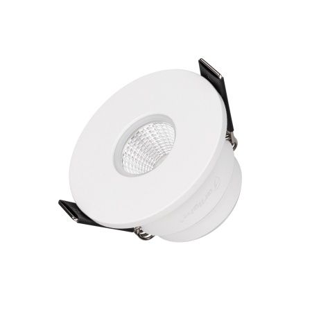 Встраиваемый светильник даунлайт. Мощность 5 Вт, св. поток 400 лм, 80 лм/Вт, теплый 3000 K, CRI>90, угол 38°, напряжение питания 230 В. Белый круглый корпус из алюминия, экран PMMA, степень защиты IP54. Размер: диаметр 54 мм, высота 30 мм.  Монтаж встраиваемый, установочное отверстие: диаметр 45 мм. Драйвер 8-12 В, 400 мА, пульсация <2%.