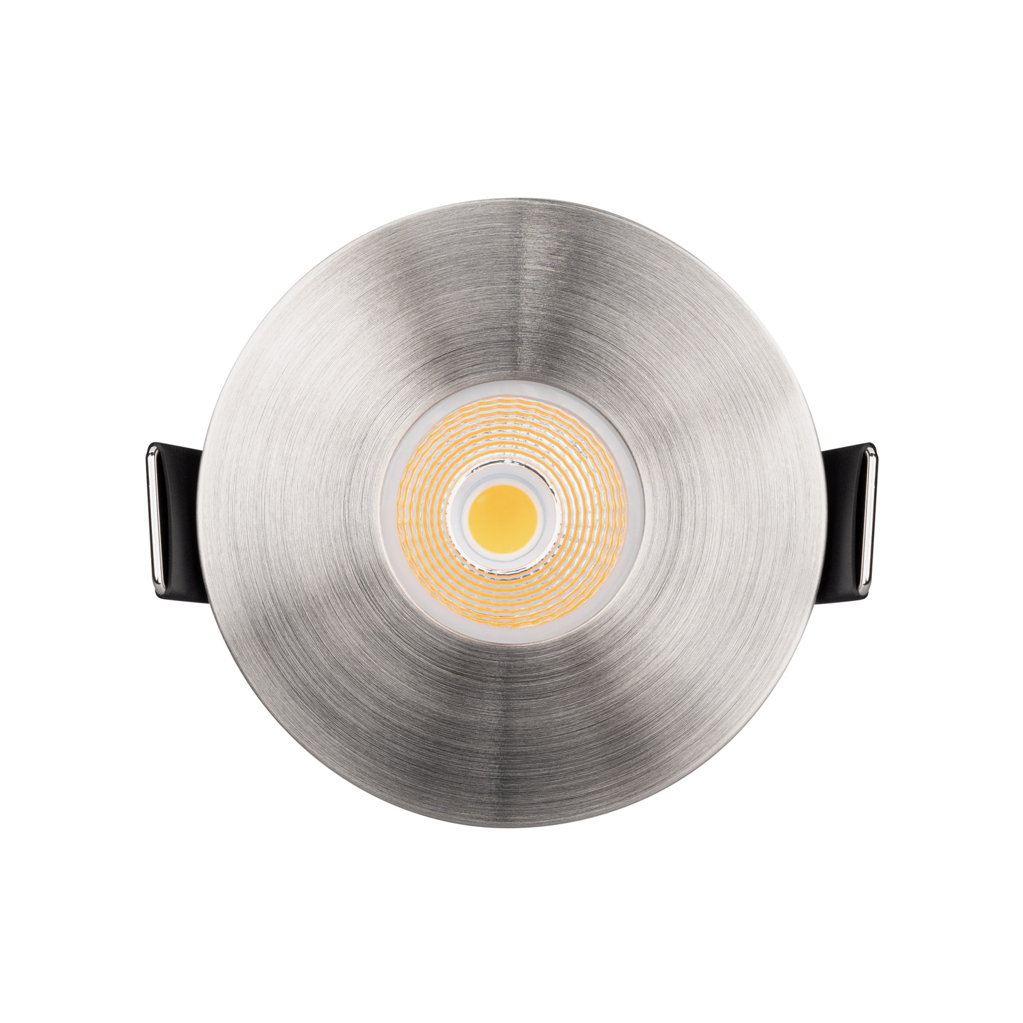 Встраиваемый светильник даунлайт. Мощность 5 Вт, св. поток 400 лм, 80 лм/Вт, дневной 4000 K, CRI>90, угол 38°, напряжение питания 230 В. Цвет Никель, круглый корпус из алюминия, экран PMMA, степень защиты IP54. Размер: диаметр 54 мм, высота 30 мм. Монтаж встраиваемый, установочное отверстие: диаметр 45 мм. Драйвер 8-12 В, 400 мА, пульсация <2%.
