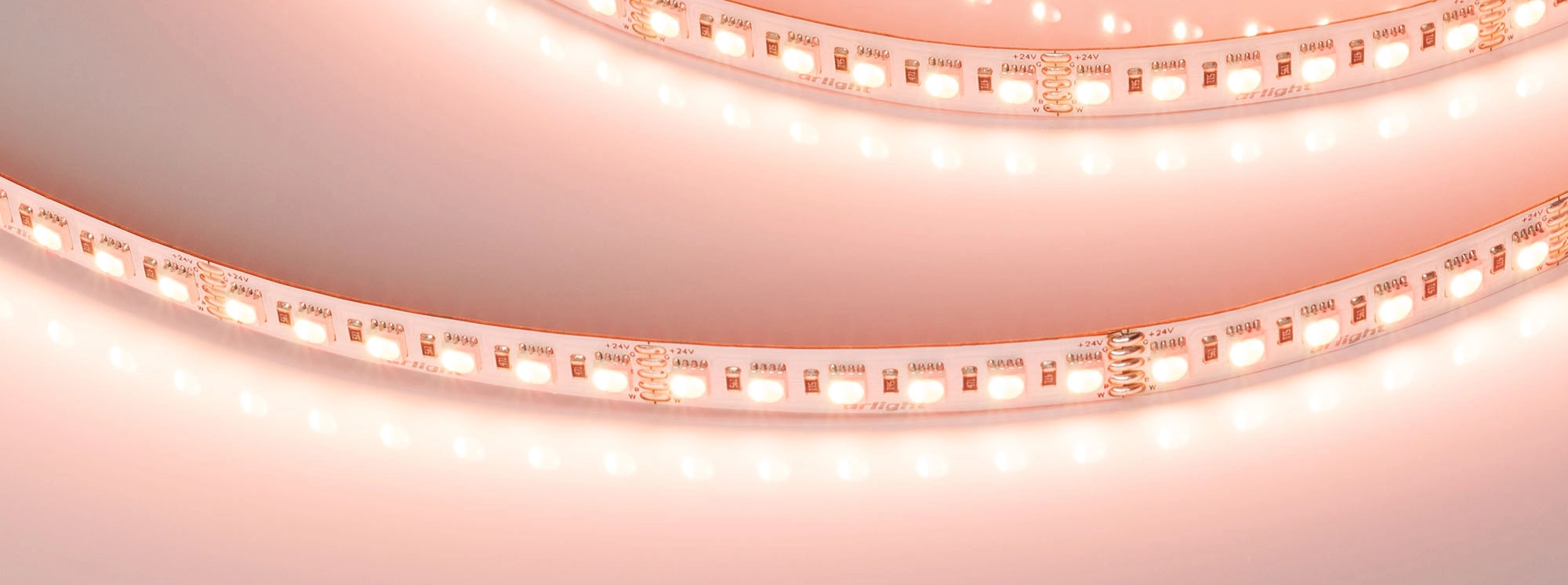 Светодиодная узкая лента RT серии H120. Светодиоды SMD 4040, 120 шт/м, белая плата шириной 10 мм, скотч 3M. Цвет RGB + ТЕПЛЫЙ 2700K, индекс цветопередачи CRI>90, угол 120°. Питание 24 В, мощность 25 Вт/м (125 Вт на 5 м). Размеры 5000x10x2.1 мм, мин. отрезок 50 мм, 6 светодиодов. Цена за 1 м.