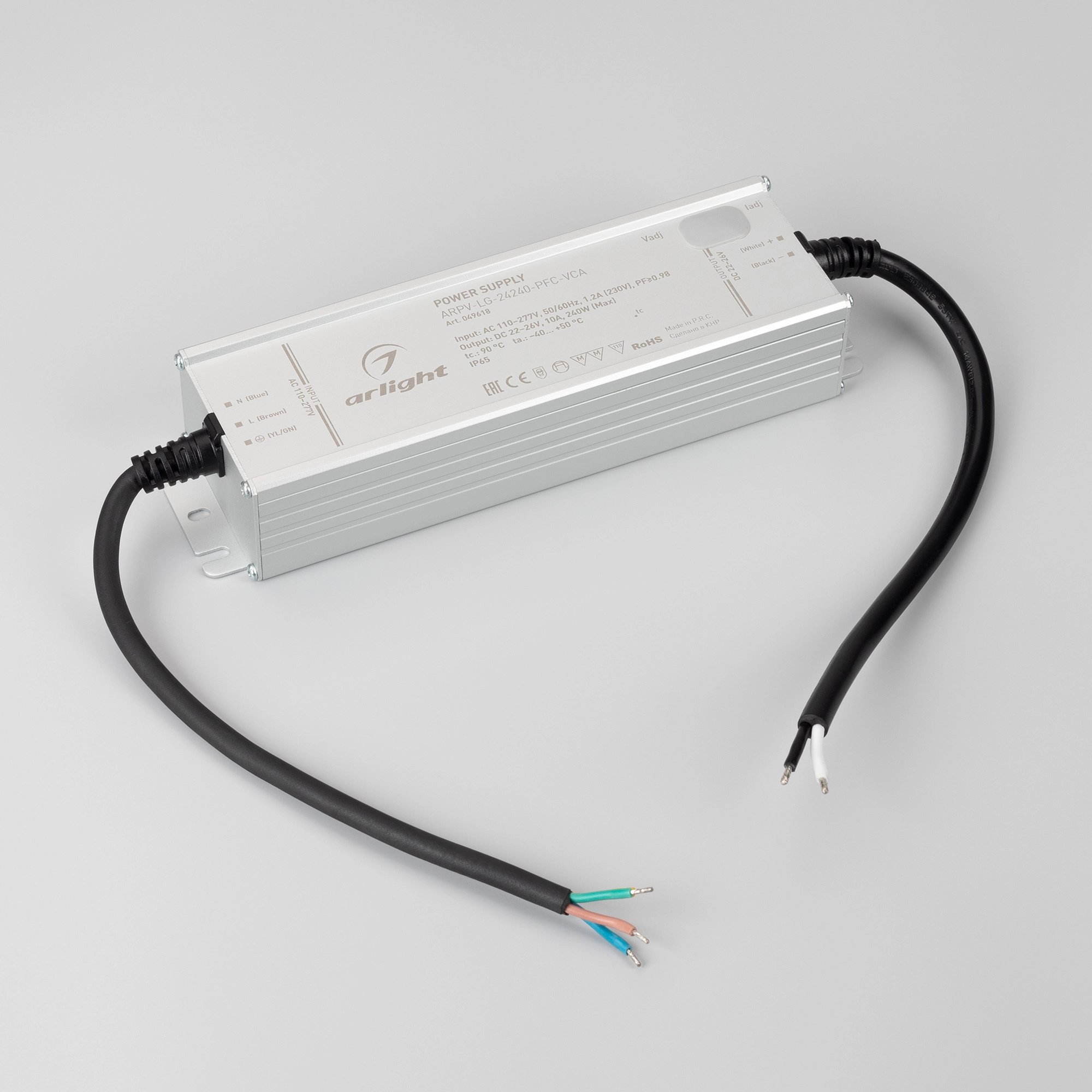 Регулируемый источник напряжения и тока с гальванической развязкой для светодиодных изделий. Входное напряжение 110-277 VAC. Выходные параметры: в режиме постоянного напряжения 22-26 В (установка по умолчанию 24В), 10 А с возможностью регулировки, 240 Вт. Встроенный PFC >0,98. Герметичный алюминиевый корпус IP65. Рабочая температура -40…+70C⁰. Габаритные размеры длина 220.6 мм, ширина 62.5 мм, высота 41.3 мм. Гарантийный срок 5 лет.