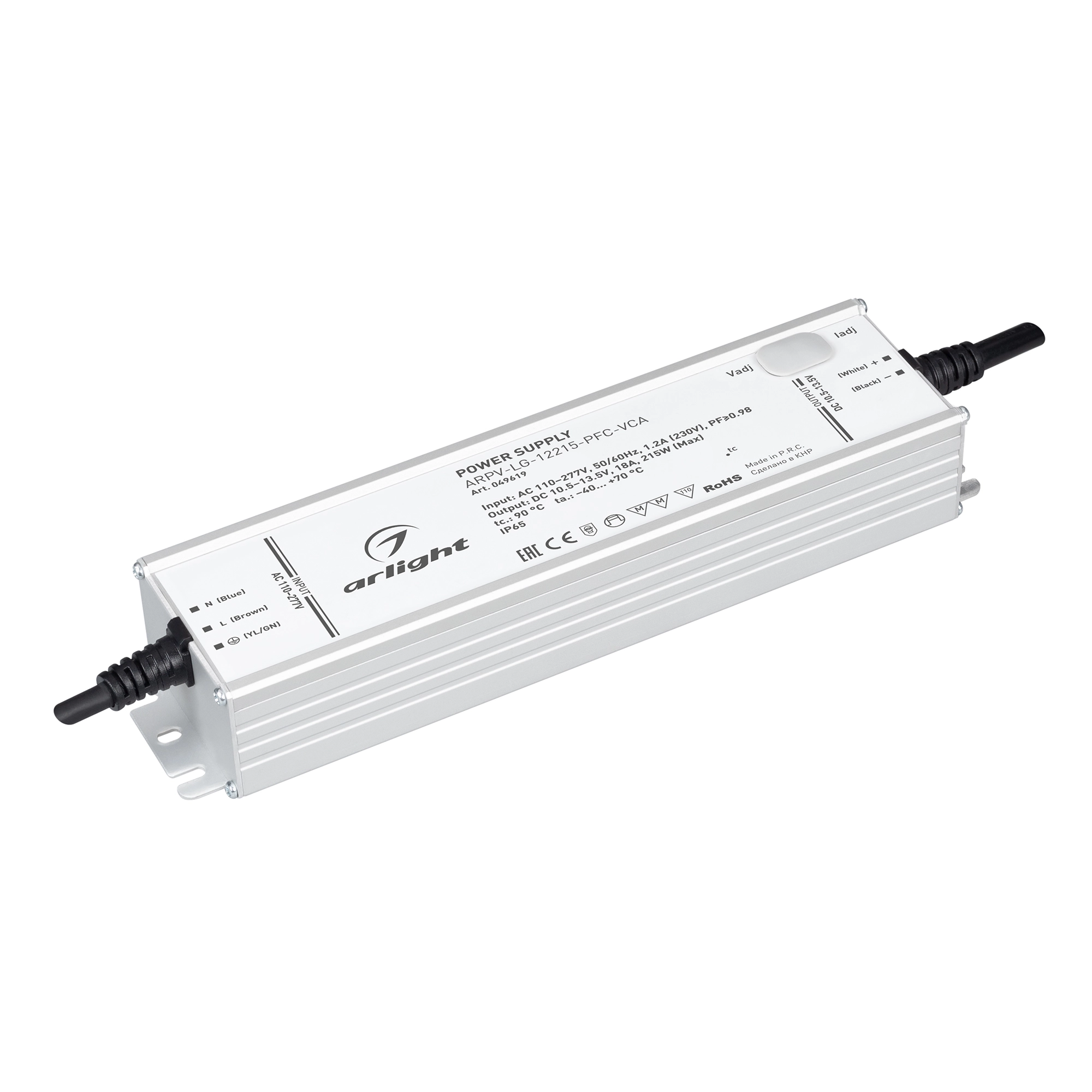 Регулируемый источник напряжения и тока с гальванической развязкой для светодиодных изделий. Входное напряжение 110-277 VAC. Выходные параметры: в режиме постоянного напряжения 10.5-13.5 В (установка по умолчанию 12В), 18 А с возможностью регулировки, 215 Вт. Встроенный PFC >0,98. Герметичный алюминиевый корпус IP65. Рабочая температура -40...70C⁰. Габаритные размеры длина 220.6 мм, ширина 62.5 мм, высота 41.3 мм. Гарантийный срок 5 лет.