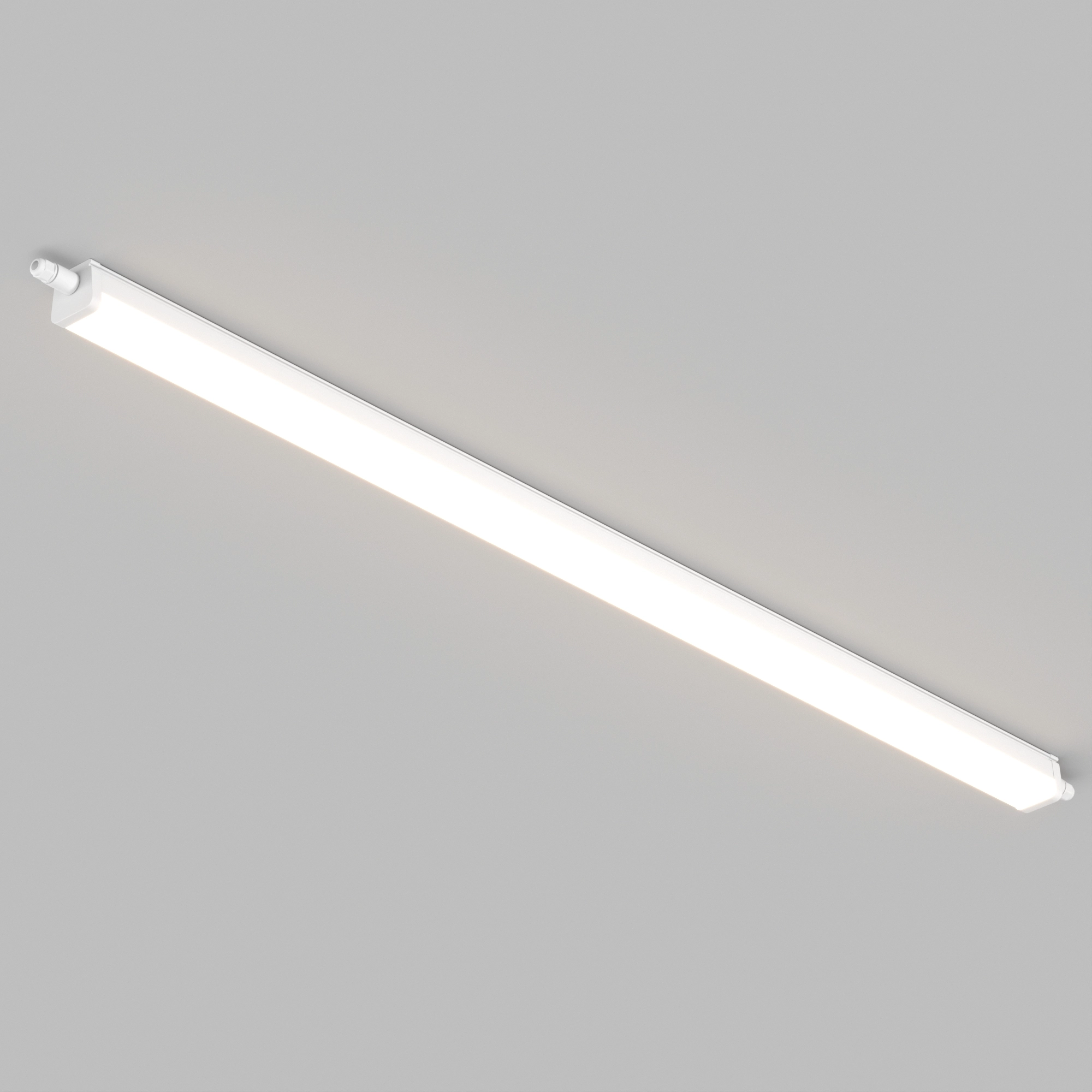 Накладной светильник 36 Вт. со встроенным микроволновым датчиком движения. Цвет свечения ДНЕВНОЙ 4000К, св.поток 4680лм, CRI(Ra)>80, угол свечения 120°. Корпус прямоугольный, белый пластик, влагозащищенный IP65. Ударопрочность IK05. Размер LxWxH 1500x62x57мм. Питание AC 220-240В, 36 Вт, драйвер встроенный. Максимальная мощность для подключения в линию 300 Вт. Настройки датчика:  Дальность действия 10,5м. Время отключения 5сек.