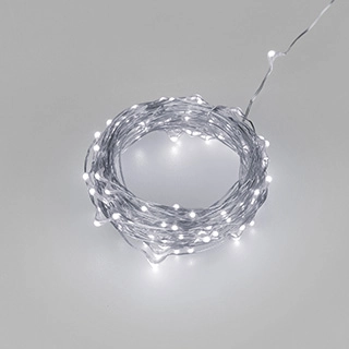 Светодиодная гирлянда РОСА (USB) серии HOME. Длина гирлянды 10 000 мм. Габариты USB разъёма 18x13x18 мм (ШxВxД). Цвет свечения ХОЛОДНЫЙ БЕЛЫЙ (6000 К), 4 динамических и 1 статический эффект свечения. 100 светодиодов SMD 1608 размером 2.1 мм, в эпоксидной заливке в форме капли, со статическим эффектом свечения. Провод из эмалированной меди, диаметр 0.4 мм.  Напряжение питания 5 В, мощность 0.7 Вт . Степень пылевлагозащиты IP20, применение в помещении. Изделие укомплектовано ПДУ с 13 кнопками для управления гирляндой, габариты 85x39x6 мм. Питание ПДУ 3VDC (CR2025). Батарейка в комплект не входит.