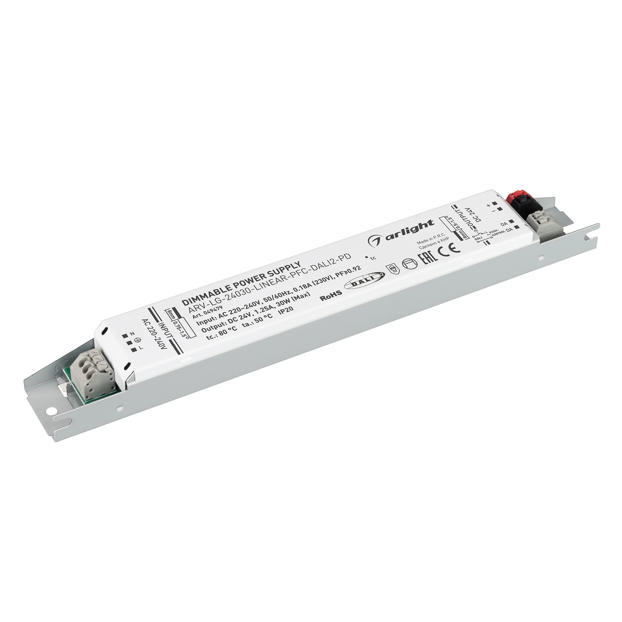 Диммируемый источник напряжения по протоколу DALI 2.0 и функцией PUSH DIM с гальванической развязкой для светодиодных изделий. Входное напряжение 220-240 VAC. Выходные параметры: 24 В, 1,25 А, 30 Вт. Встроенный PFC >0.95. Негерметичный алюминиевый корпус IP 20. Габаритные размеры длина 230 мм, ширина 30 мм, высота 21 мм. Гарантийный срок 5 лет.