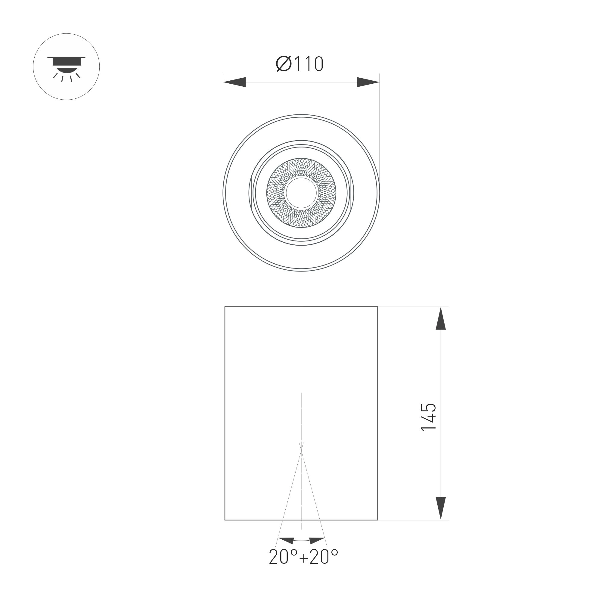 Накладной интерьерный светильник. Мощность 18 Вт, св. поток 1700 лм, 99 лм/Вт, дневной 4000 K, CRI>90, угол 15°, регулируемое направление луча 40°(20+20), поворотный световой модуль вокруг своей оси на 340°,  UGR <11, напряжение питания 230 В. Белый круглый корпус из алюминия, степень защиты IP54. Размер: диаметр 110 мм, высота 145 мм. Монтаж накладной. Драйвер 27-42 В, 450 мА, пульсация <1%.