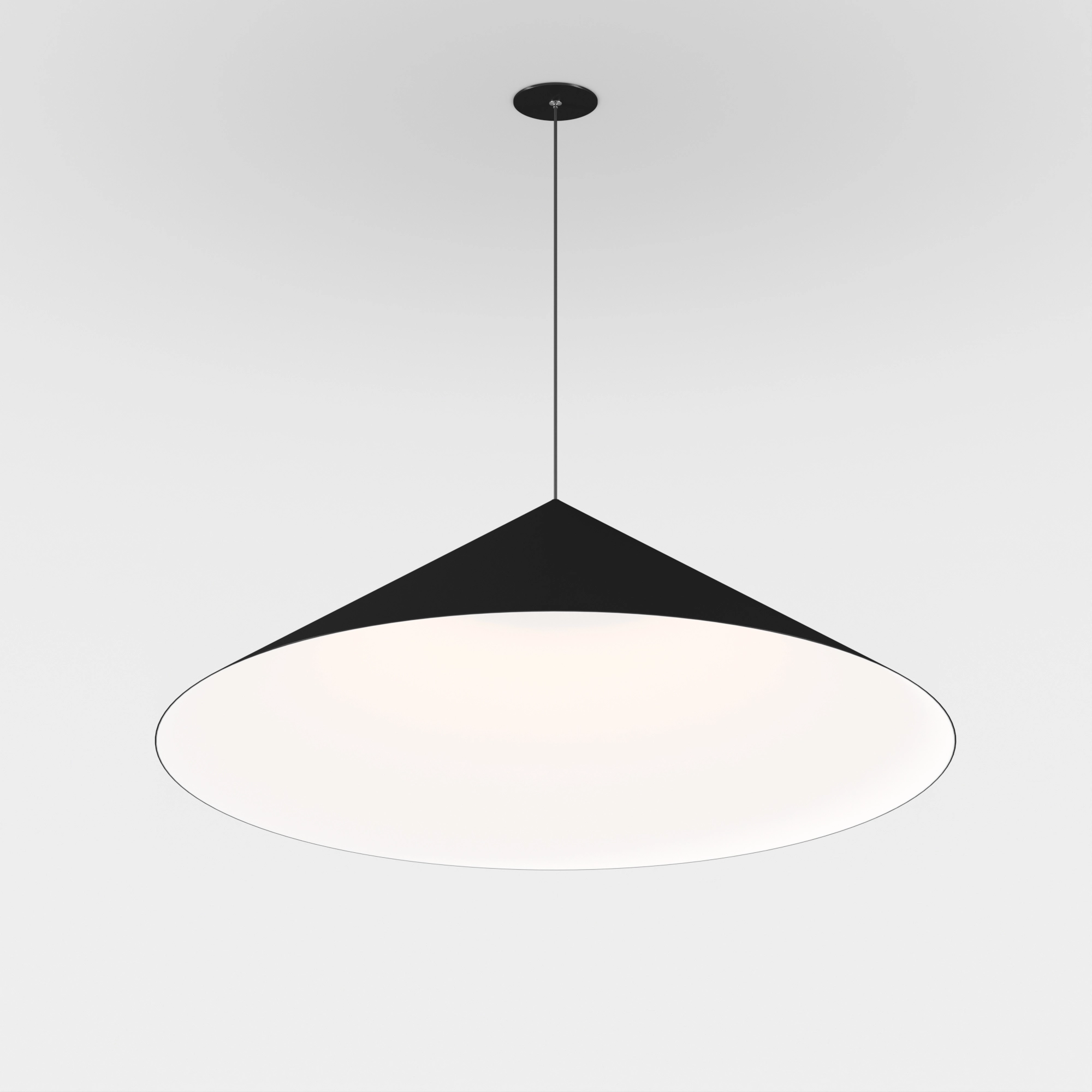 Подвесной светильник. Мощность 14 Вт, св. поток 1300 лм, 90 лм/Вт, теплый 3000 K, CRI>90, угол 36°, напряжение питания 230 В. Черный корпус из алюминия в форме конуса с белой внутренней поверхностью, линза-рассеиватель из PMMA, степень защиты IP20. Размер: диаметр 750 мм, высота 230 мм. Монтаж подвесной, длина подвеса 2000 мм, регулируемая. В комплекте 2 вида чаш. Габариты встраиваемой чаши: Ø 80x23 мм. Габариты накладной чаши Ø140x55 мм. Драйвер 27-42 В, 350 мА, пульсация <1%. Управление по TRIAC.