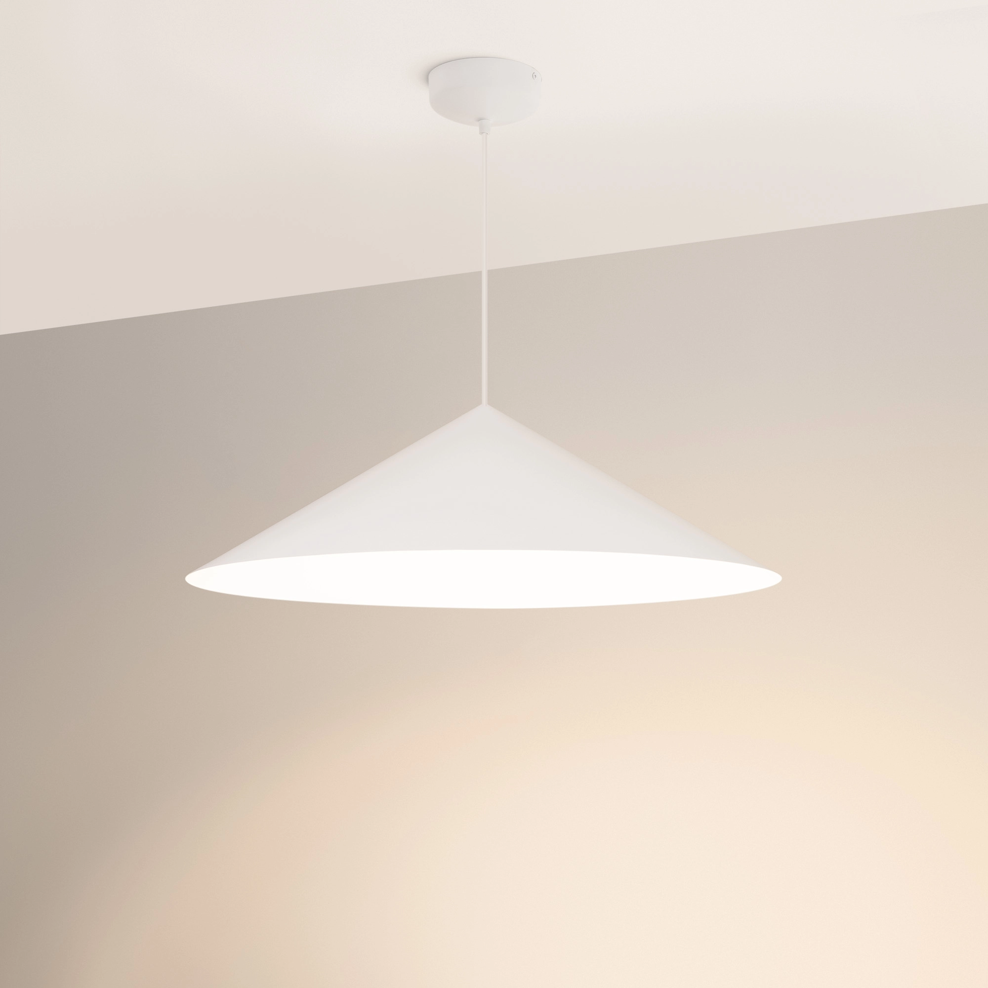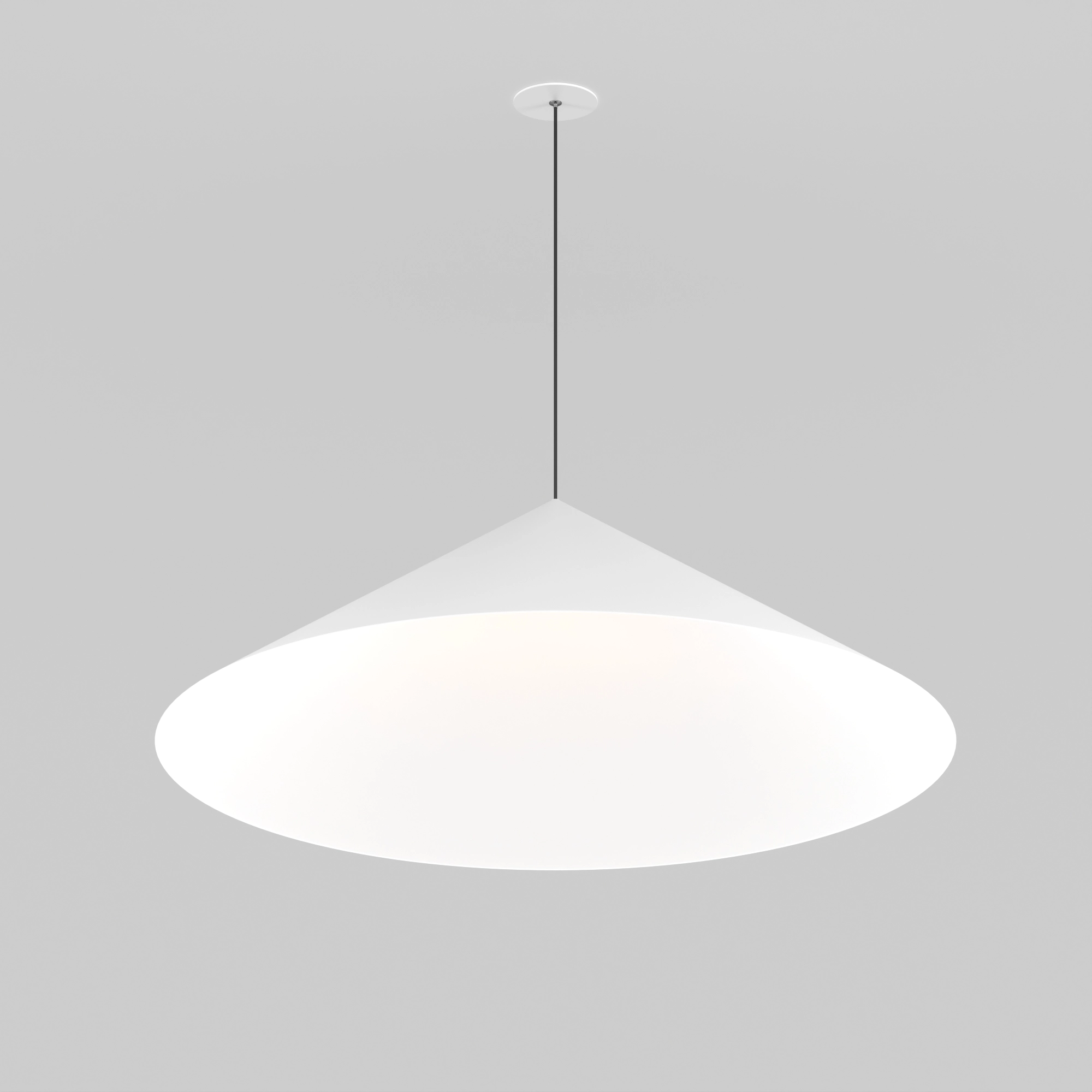Подвесной светильник. Мощность 14 Вт, св. поток 1300 лм, 90 лм/Вт, теплый 3000 K, CRI>90, угол 36°, напряжение питания 230 В. Белый корпус из алюминия в форме конуса с белой внутренней поверхностью, линза-рассеиватель из PMMA, степень защиты IP20. Размер: диаметр 750 мм, высота 230 мм. Монтаж подвесной, длина подвеса 2000 мм, регулируемая. В комплекте 2 вида чаш. Габариты встраиваемой чаши: Ø 80x23 мм. Габариты накладной чаши Ø140x55 мм. Драйвер 27-42 В, 350 мА, пульсация <1%. Управление по TRIAC.