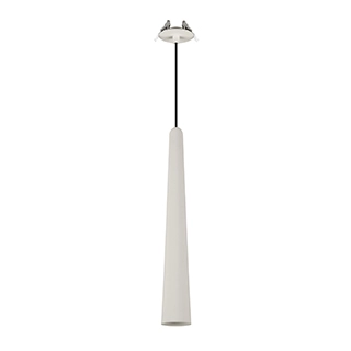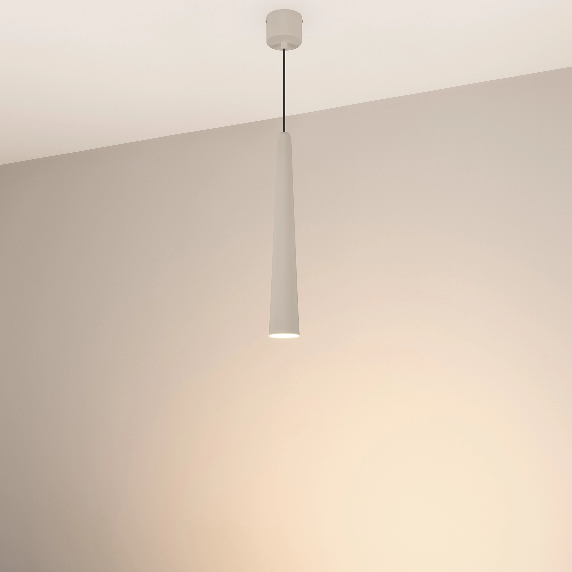 Подвесной светильник. Мощность 5 Вт, св. поток 400 лм, световая эффективность 70 лм/Вт, теплый 3000K, CRI>90, угол 36°, напряжение питания 230 В. Светло - серый конусообразный вытянутый корпус из алюминия, линза из PMMA, степень защиты IP20. Размер: диаметр 57 мм, высота 400 мм. Монтаж подвесной, длина подвеса 2000 мм, регулируемая. В комплекте 2 вида чаш. Габариты встраиваемой чаши: Ø 80x41 мм. Габариты накладной чаши Ø80x60 мм. Драйвер 2,8-12В, 500 мА, пульсация <1%.