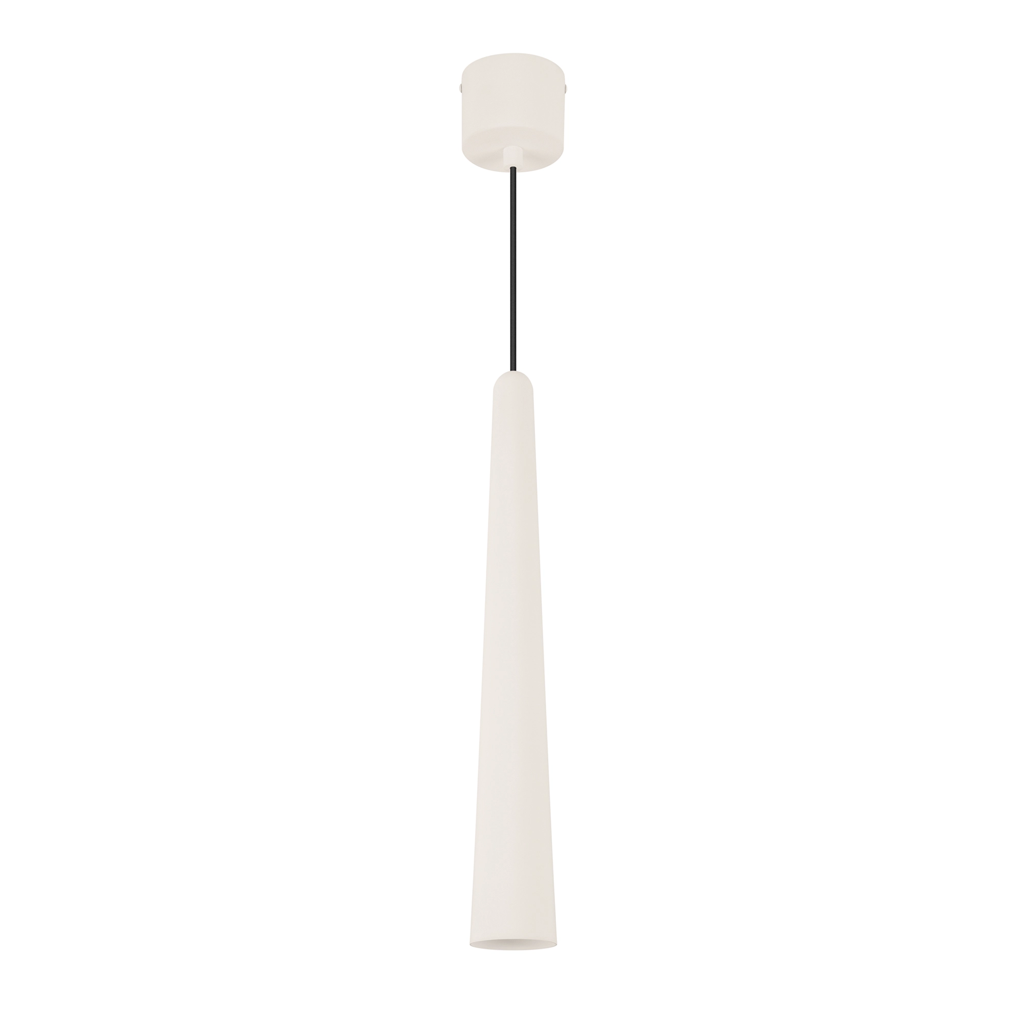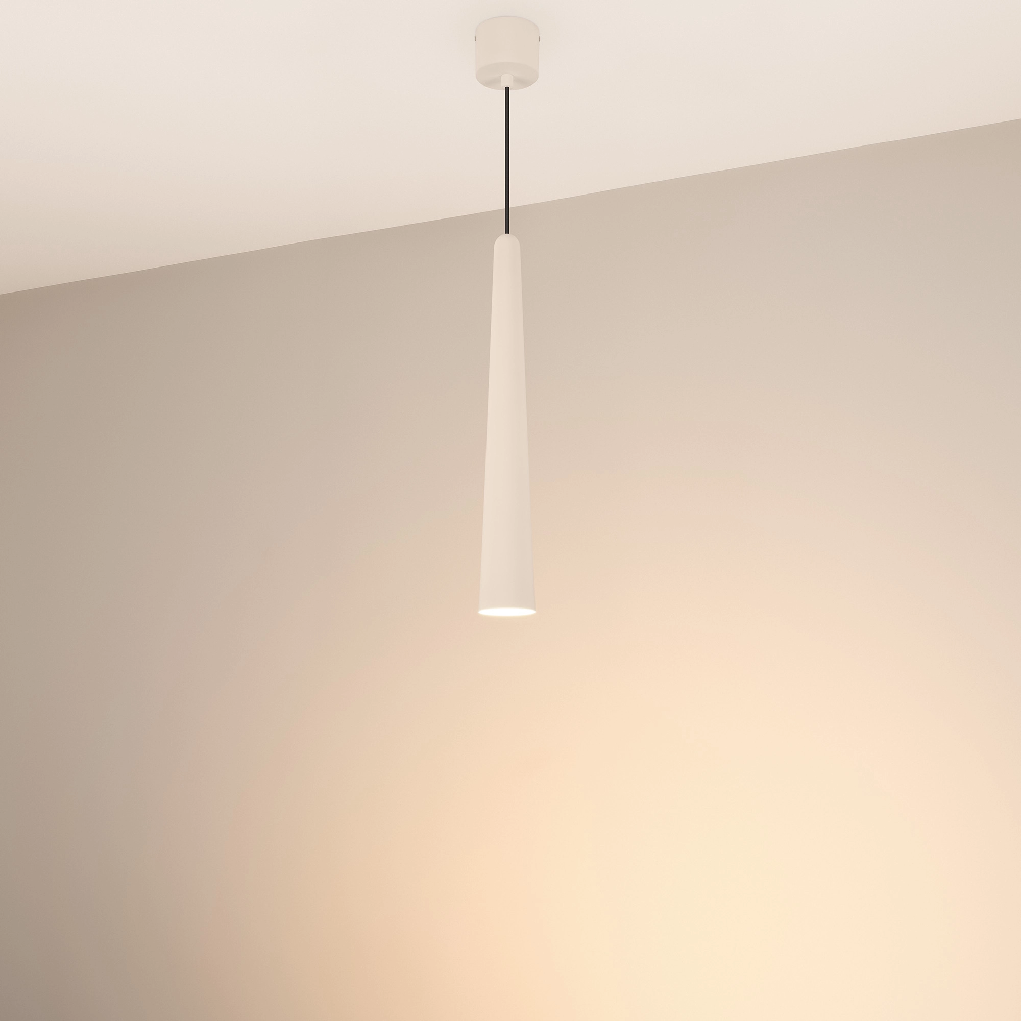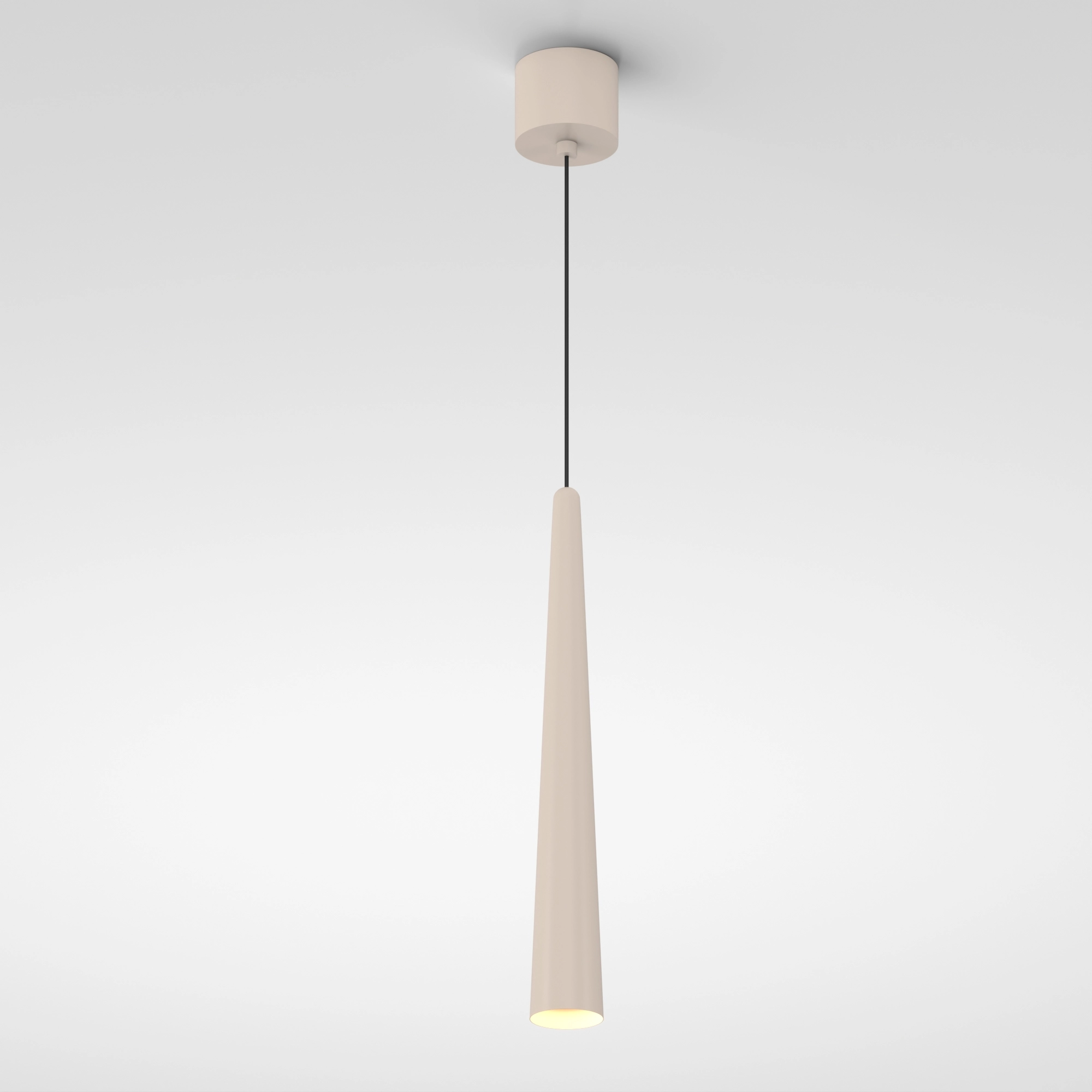 Подвесной светильник. Мощность 5 Вт, св. поток 400 лм, световая эффективность 70 лм/Вт, теплый 2700 K, CRI>90, угол 36°, напряжение питания 230 В. Кремовый конусообразный вытянутый корпус из алюминия, линза из PMMA, степень защиты IP20. Размер: диаметр 57 мм, высота 400 мм. Монтаж подвесной, длина подвеса 2000 мм, регулируемая. В комплекте 2 вида чаш. Габариты встраиваемой чаши: Ø 80x41 мм. Габариты накладной чаши Ø80x60 мм. Драйвер 2,8-12В, 500 мА, пульсация <1%.