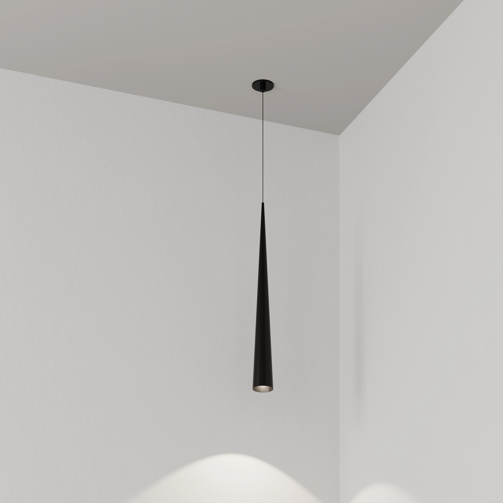 Подвесной светильник. Мощность 5 Вт, св. поток 400 лм, 70 лм/Вт, теплый 2700 K, CRI>90, угол 36°, напряжение питания 230 В. Чёрный конусообразный вытянутый корпус из алюминия, линза из PMMA, степень защиты IP20. Размер: диаметр 76 мм, высота 670 мм. Монтаж подвесной, длина подвеса 2000 мм, регулируемая. В комплекте 2 вида чаш. Габариты встраиваемой чаши: Ø 80x41 мм. Габариты накладной чаши Ø80x60 мм. Драйвер 2,8-12В, 500 мА, пульсация <1%.