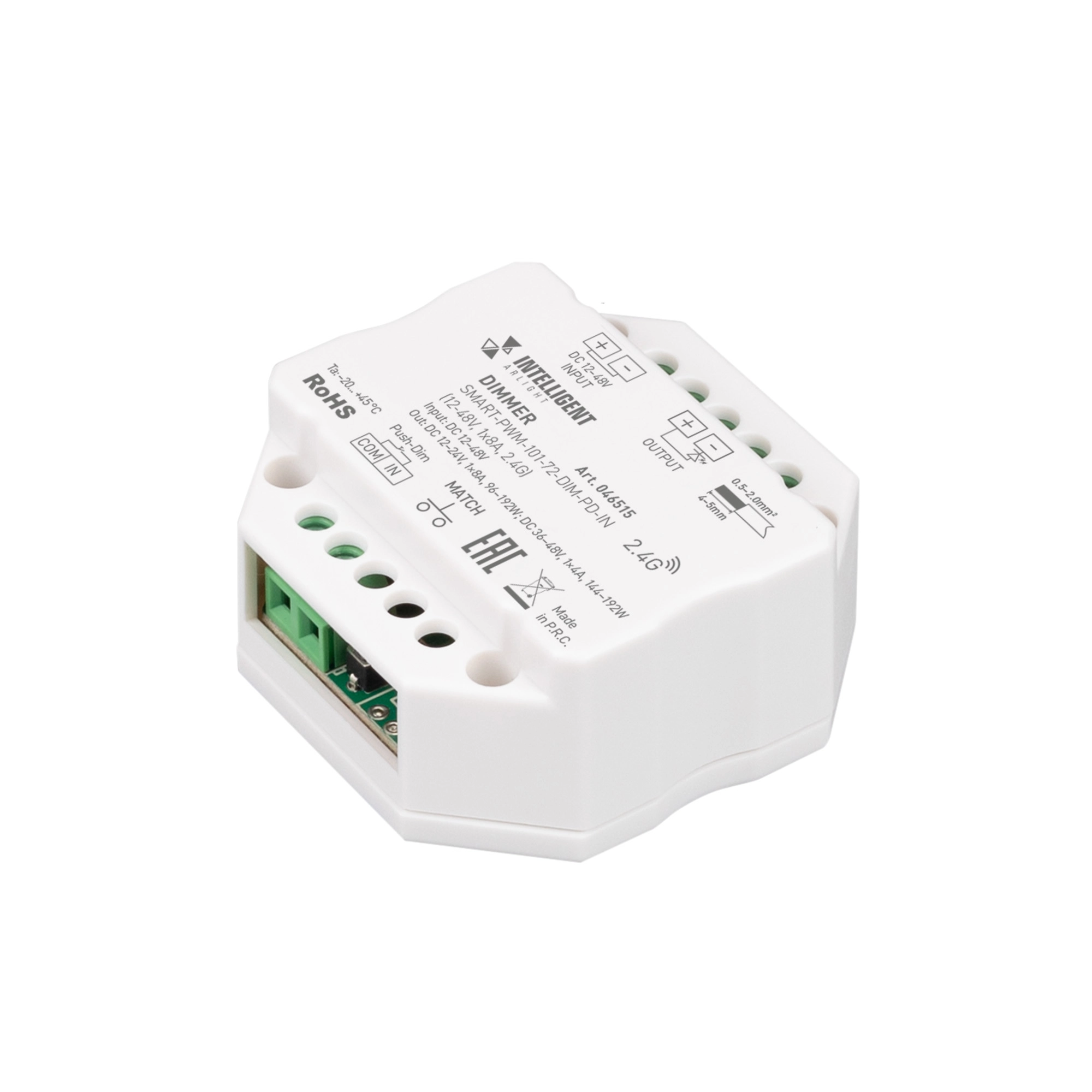 Диммер для монохромной светодиодной ленты (ШИМ) с функцией Push-Dim. Питание/рабочее напряжение 12-48VDC, максимальный ток 8A на канал при напряжении (DC12-24V) и 4А на канал при напряжении (DC36-48V), 1 канал. Максимальная мощность для 12-24V - 96-192W, для 36-48V - 144-192W. Винтовые клеммы, корпус - пластик. Габариты 52x52x26 мм, встраивается в стандартный подрозетник. Совместим с пультами и панелями SMART, поддерживающими диммирование по радиоканалу 2.4G.