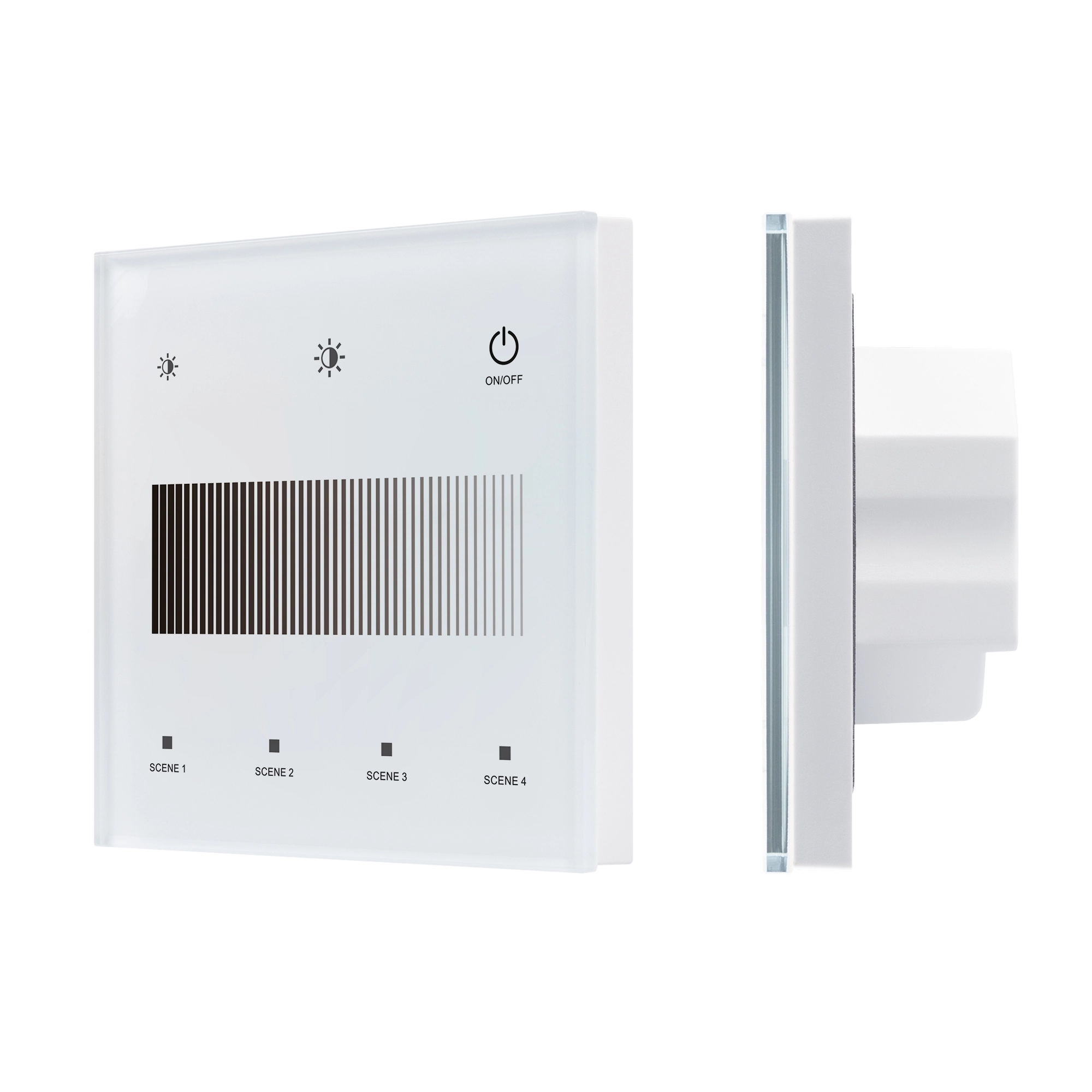Встраиваемая стеклянная сенсорная панель DIM с выходом DALI. Цвет- белый. Управление DALI 1 адрес / DALI группа / DALI Broadcast. Установка адресов управления выполняется переключателями на корпусе. Питание 24VDC, либо по шине DALI.  Сохранение 4-х пользовательских сценариев. Доступно управление с помощью пультов RF 2.4GHz серии SMART. Размеры: 86x86x34.5 мм