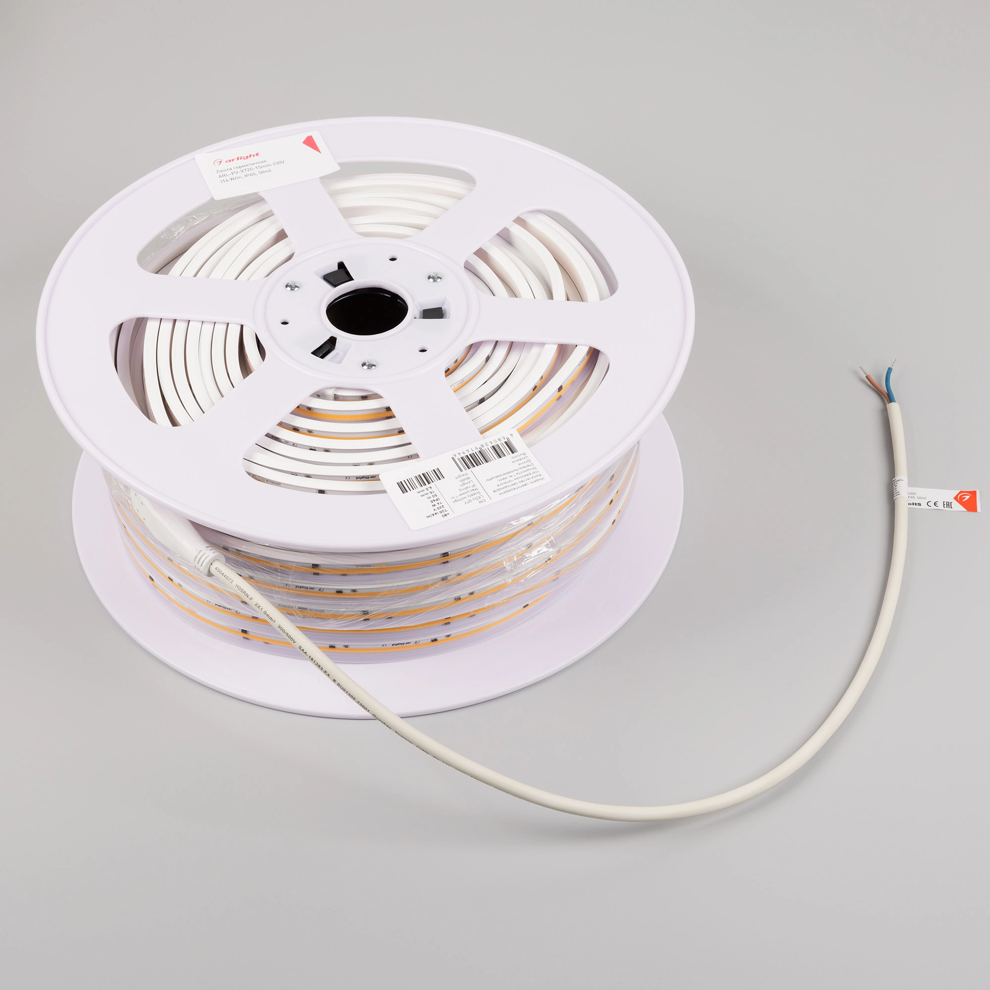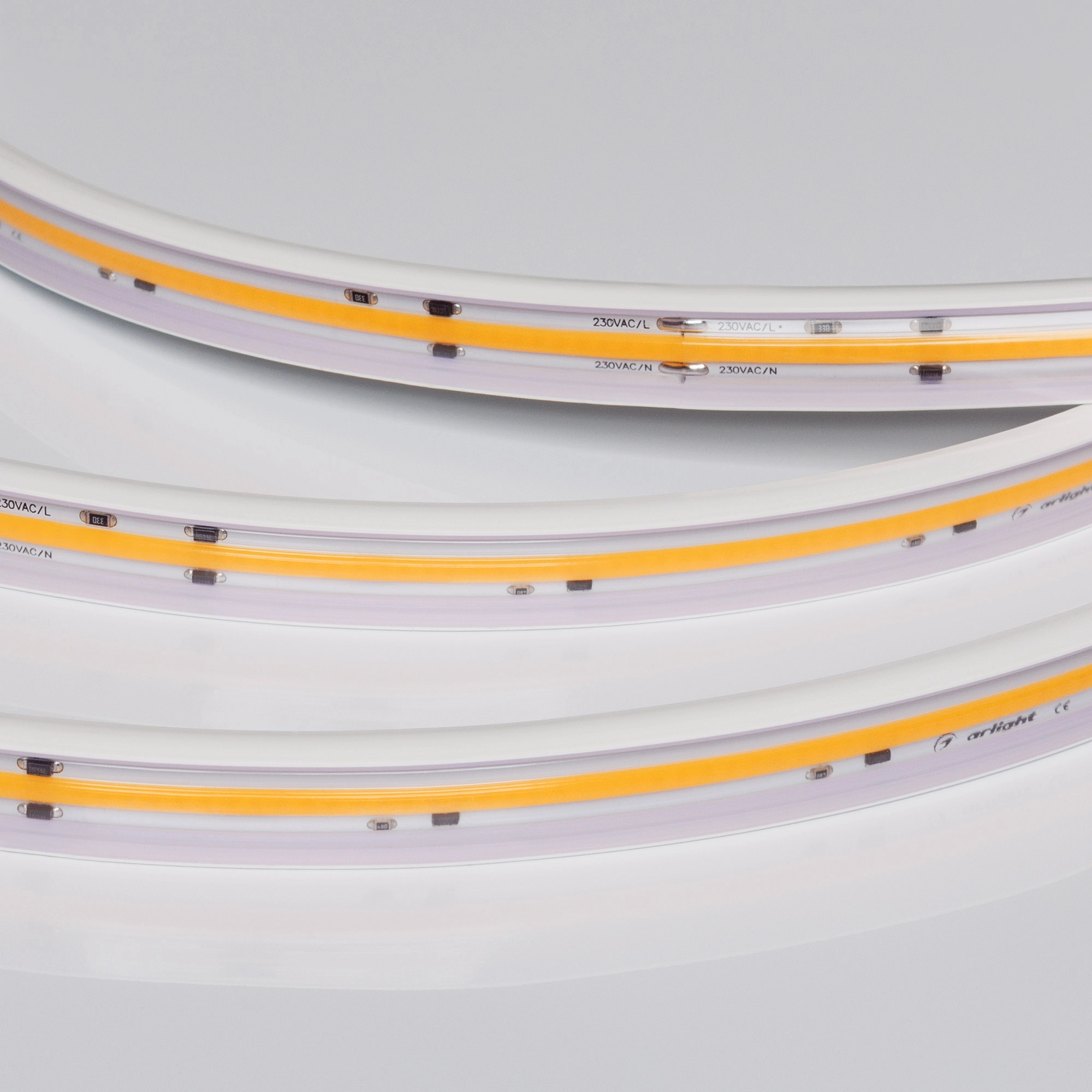 Светодиодная герметичная лента ARL сплошного свечения серии X720, IP65 (PV - трубка ПВХ экструзия). Светодиоды CSP, 720 шт/м, белая плата шириной 12 мм, крепление на силиконовые скобы (скотч 3M отсутствует). Цвет ДНЕВНОЙ 4000K, индекс цветопередачи CRI>80, угол 180°. Питание 230 В, мощность 14 Вт/м (700 Вт на 50 м). Размеры 50000x15x6.5 мм. Мин. отрезок 250 мм, 180 светодиодов. Цена за 1 м.