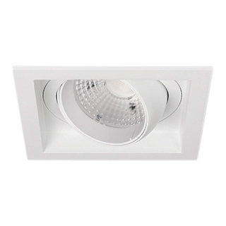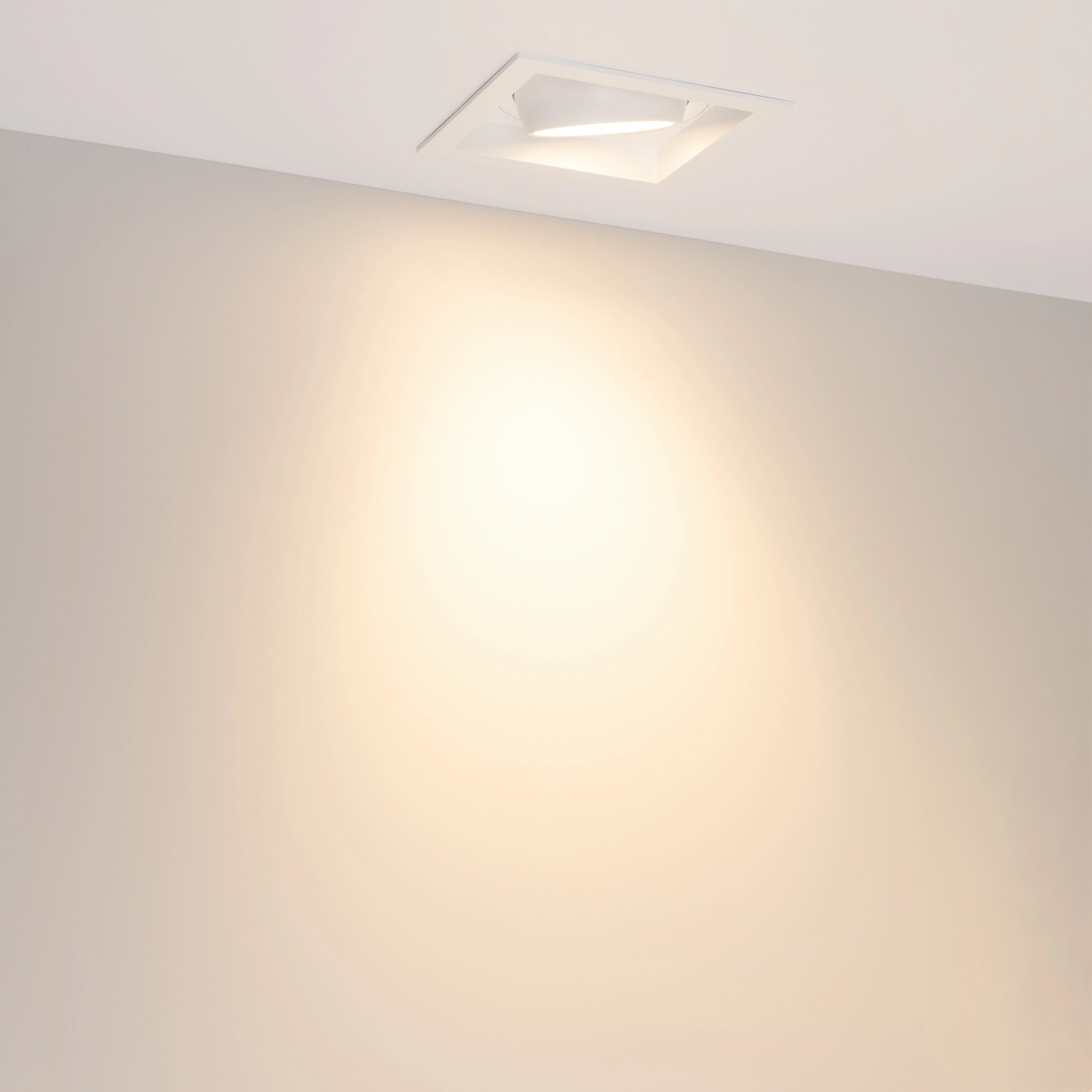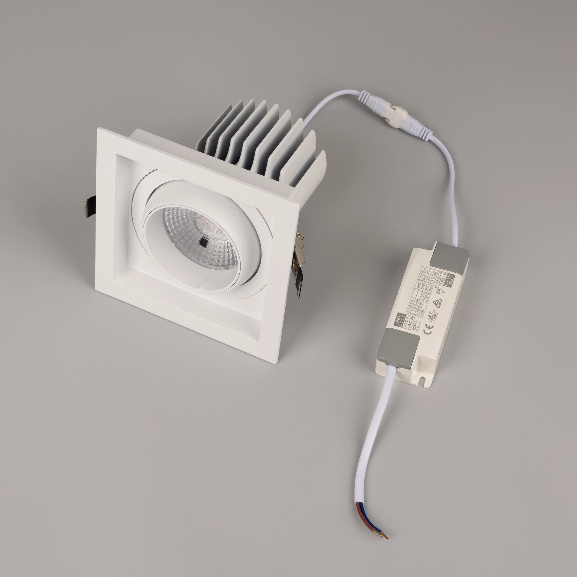 Встраиваемый карданный светильник. Мощность 30 Вт, св. поток 2650 лм, 88 лм/Вт, тёплый 3000 K, CRI>92, угол 50°, напряжение питания 230 В. Белый корпус из алюминия, белая вставка, степень защиты IP20. Размер: длина 140 мм, ширина 140 мм, высота 125 мм. Монтаж встраиваемый, установочное отверстие: длина 120 мм, ширина 120 мм. Драйвер 24-42 В, 750 мА, пульсация <2%.