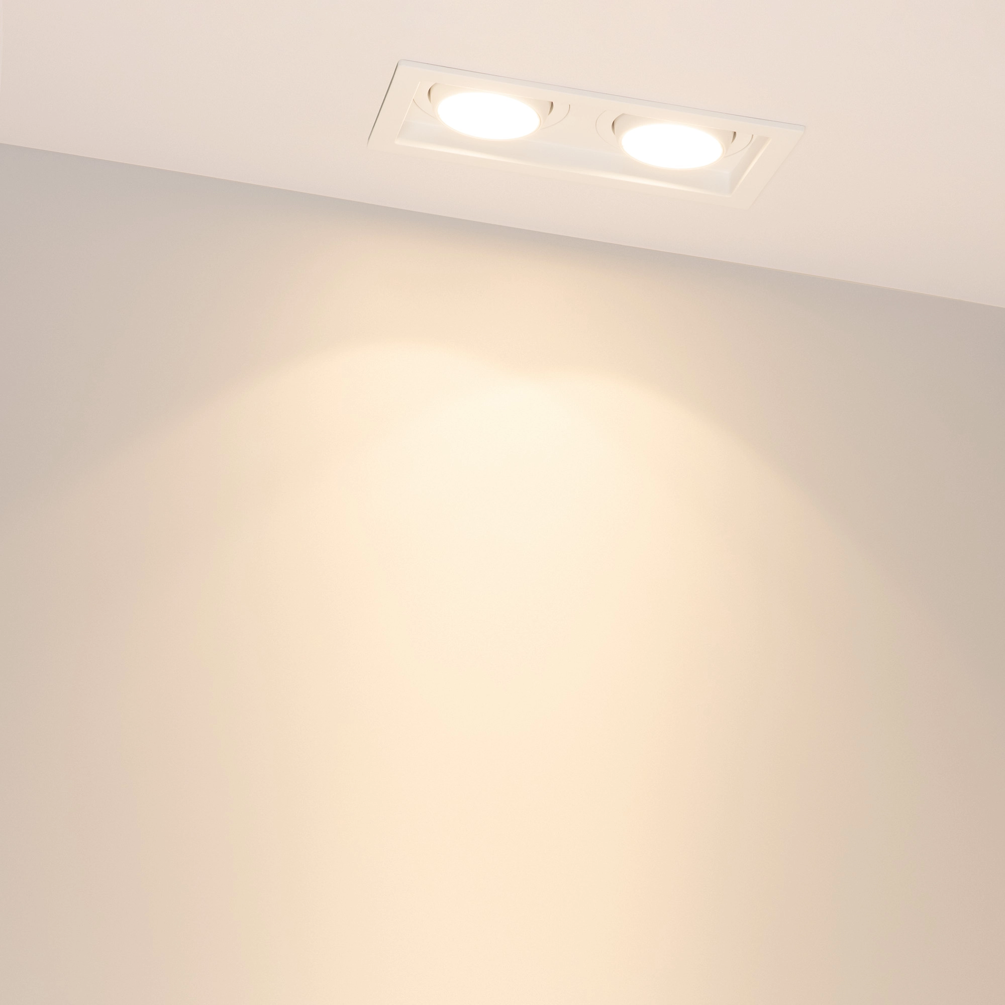 Встраиваемый карданный светильник. Мощность 2х12 Вт, св. поток 2636 лм, 109 лм/Вт, тёплый 3000 K, CRI>92,  угол 20°, напряжение питания 230 В. Белый корпус из алюминия, белая вставка, степень защиты IP20. Размер: длина 170 мм, ширина 90 мм, высота 80 мм. Монтаж встраиваемый, установочное отверстие: длина 155 мм, ширина 75 мм. Драйвер 27-40 В, 300 мА, пульсация <2%.
