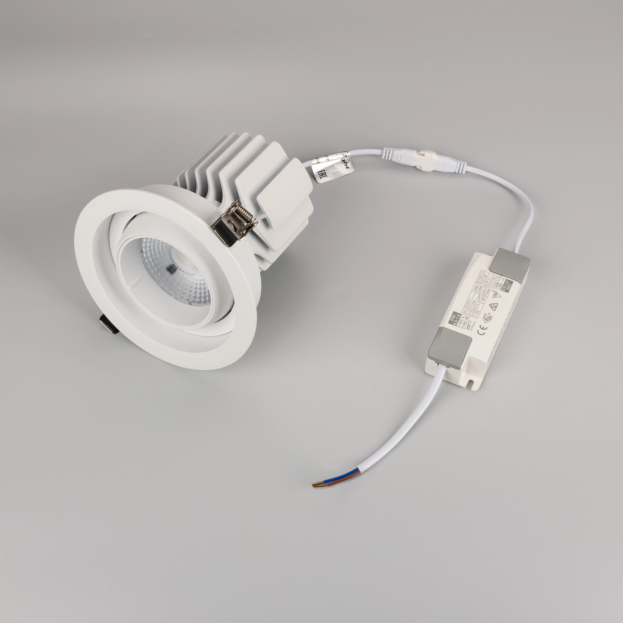 Встраиваемый карданный светильник. Мощность 30 Вт, св. поток 2650 лм, 89 лм/Вт, тёплый 3000 K, CRI>92, угол 50°, напряжение питания 230 В. Белый корпус из алюминия, белая вставка, степень защиты IP20. Размер: диаметр 135 мм, высота 125 мм. Монтаж встраиваемый, установочное отверстие: диаметр 120 мм. Драйвер 24-42 В, 750 мА, пульсация <2%.